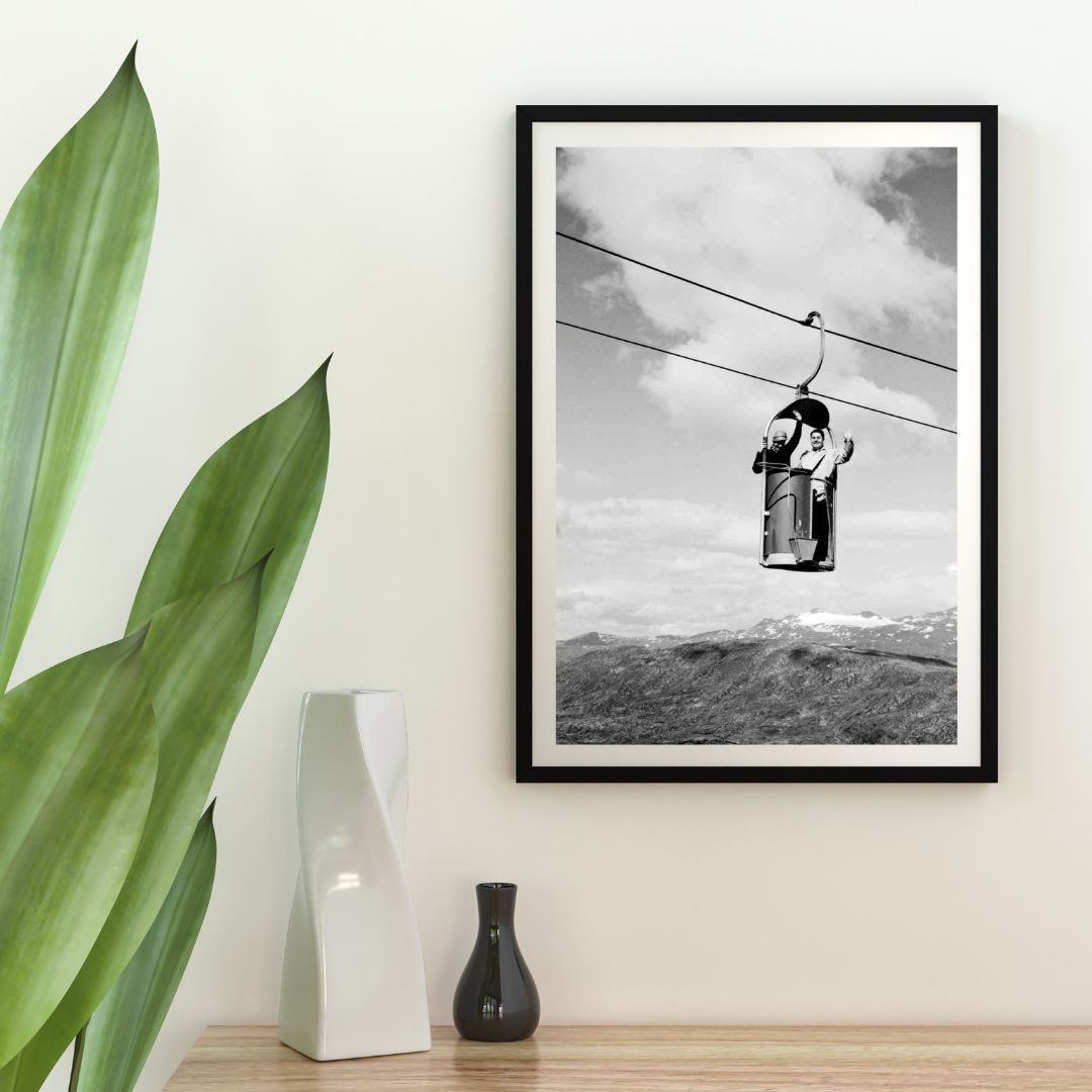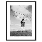 Poster with motifs from the cable car at the Riksgränsen, inaugurated in 1956. The cable car was a pioneering achievement in the Swedish ski industry and tourism. As one of the country's first cable cars, it played a key role in making Riksgränsen a prominent destination for winter sports enthusiasts.