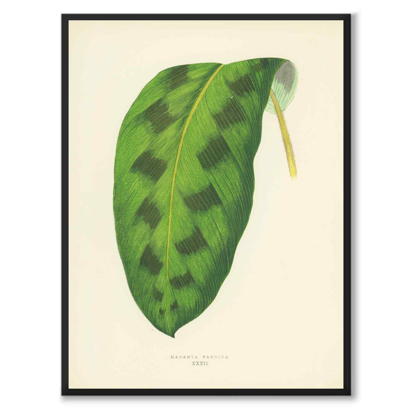 This classic illustration shows the leaf of the popular houseplant Maranta and the Latin name of the plant below; Maranta pardina.