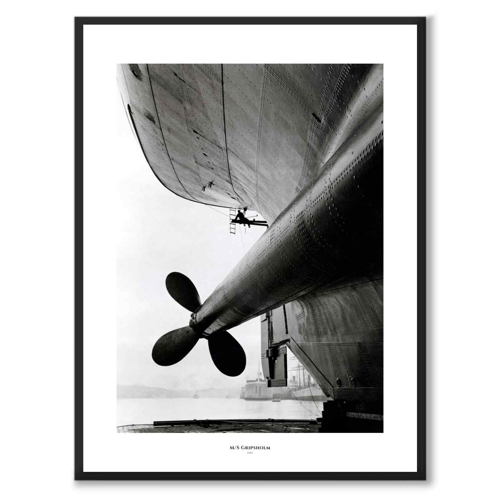 Poster with a picture of the right propeller and rudder of the famous ship M/S Gripsholm. The picture is probably from 1925 and taken at the yard  Armstrong, Whitworth & Co, Ltd in Newcastle in England where the ship was built.