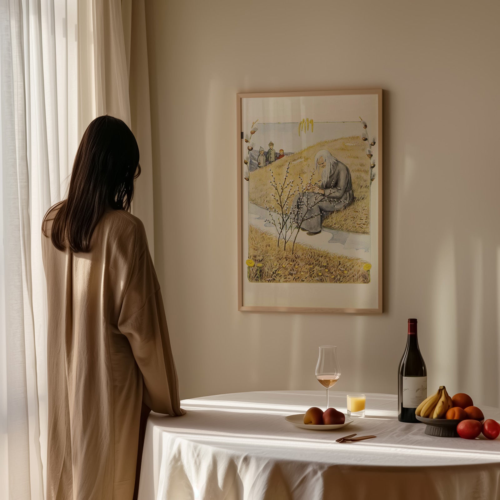 In the book it says: Mars with his long beard lures the children out of the wall, lures little chicks with dew and then embeds them in snow. He is stern when he is young, harsh as the king of winter himself, but he thaws out in the end, before his hourglass has run out. Swinging then so gentle and smooth, the little ones pee on the willow branch and hum: "my kitty miss, keep yourself beautiful in your skin, stuck on tough ditches and with scales on your bare legs, laughing in rows stand little tussilago sisters!