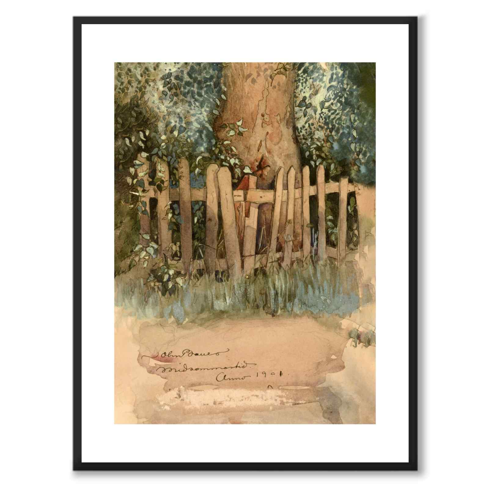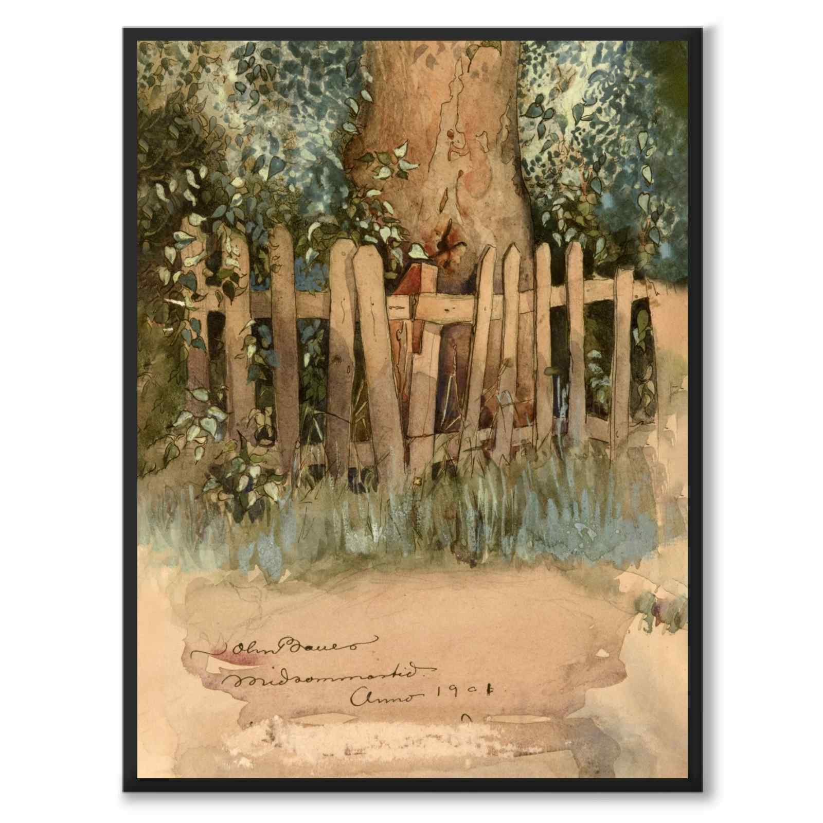 Poster featuring the painting Midsummer's Day by the iconic artist John Bauer from 1901. The painting is a watercolored ink drawing depicting a fence and tree. Bauer has also signed the painting with his name, the title of the painting and the year.