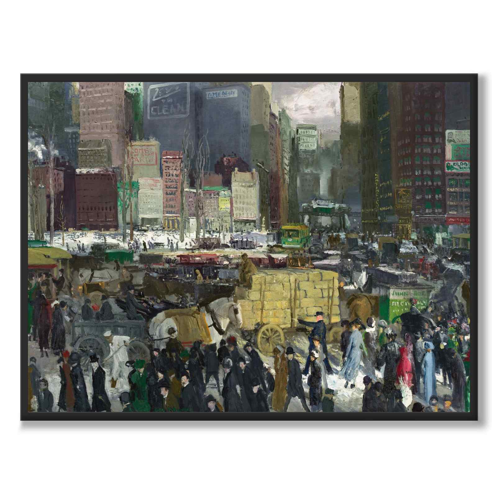 In the picture we see a snowy and populous New York in 1911. From 1907 to 1915, Bellows executed a series of paintings depicting New York in snowy weather, which became experiments in which he developed his strong sense of light and structure. Bellow's urban motifs from New York described the harsh living conditions of the working class, but were also a satire against the upper class.