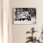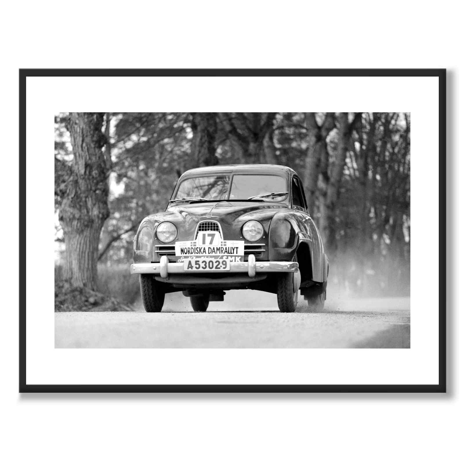 Poster with a picture of a rally picture of the model Saab 93 at the Nordic Ladies' Rally in 1960. The start of the competition was from the Foresta Hotell on Lidingö in Stockholm.