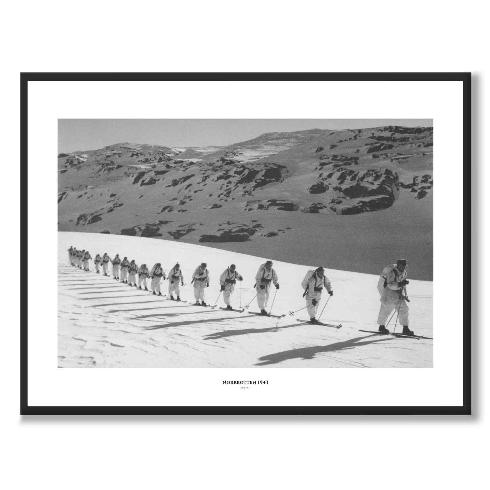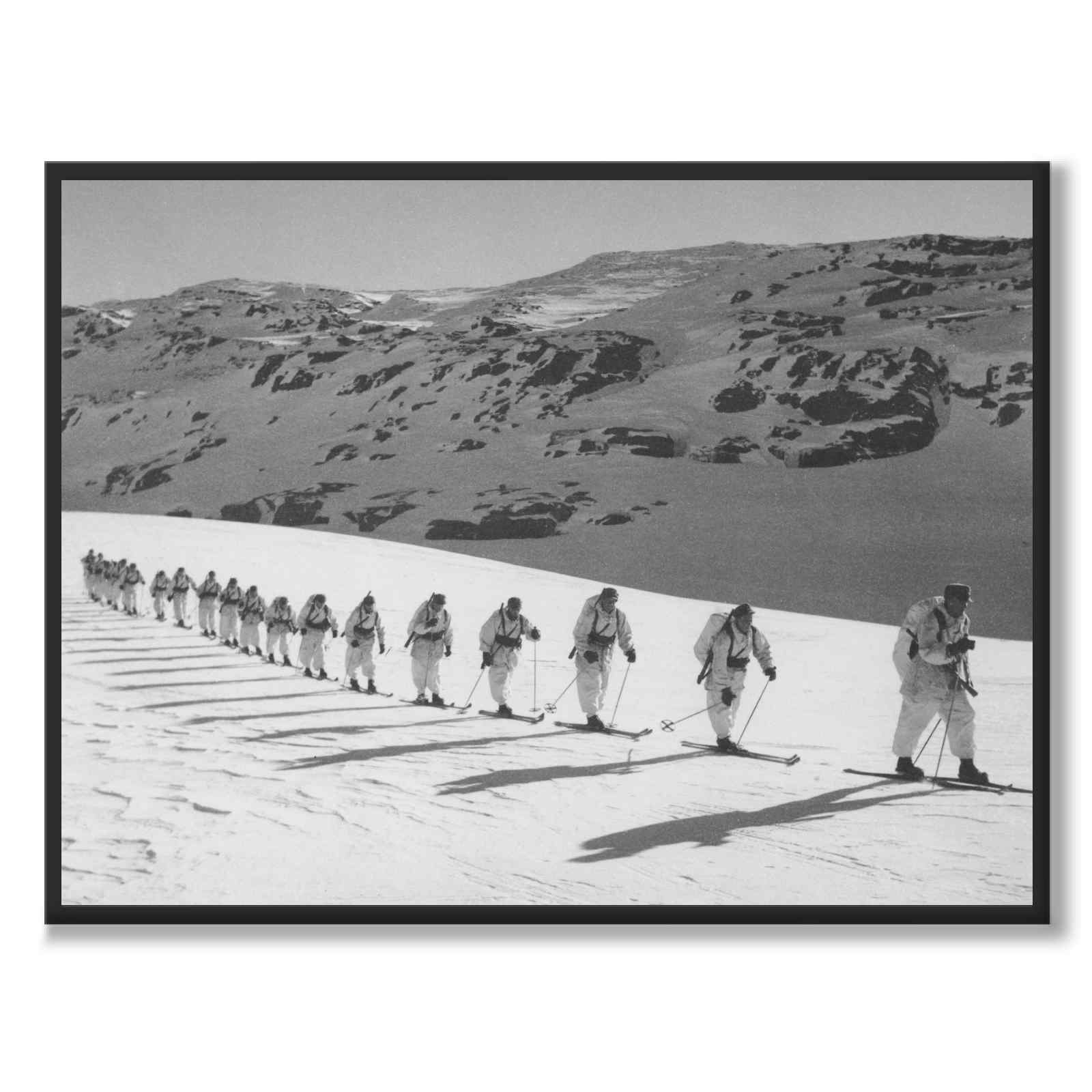 Poster with a beautiful picture of a snow-covered landscape from 1943. In the picture we see Swedish armed soldiers in snowsuits skiing in the Swedish mountains.