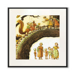 In this illustration we see when Ocke, Nutta and Pillerill return home to Fru Ollon after the fast-paced adventure. Ocke and Nutta are sitting on the squirrel Korre's back, while Pillerill is running towards mother's arms.