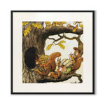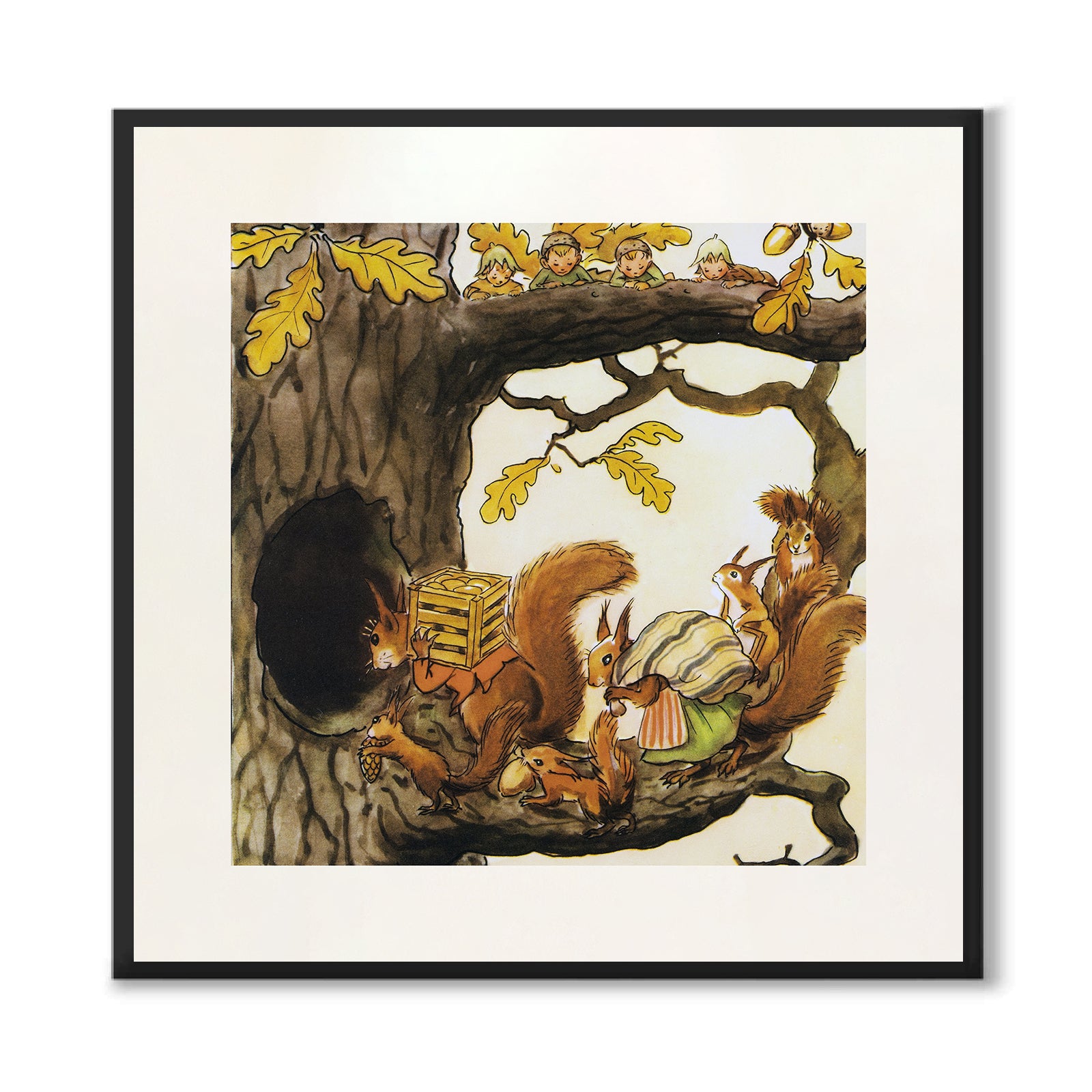 In this illustration we see the squirrel family moving their things. The first squirrel has a large wooden box on its back, and the mother squirrel has a large cloth sack with her. On a branch a little further up we see four children looking down at what is happening.
