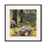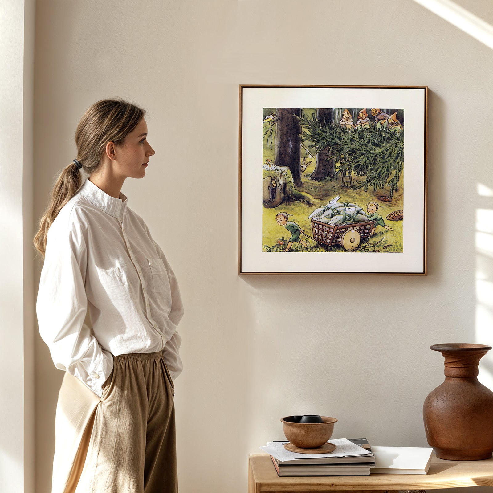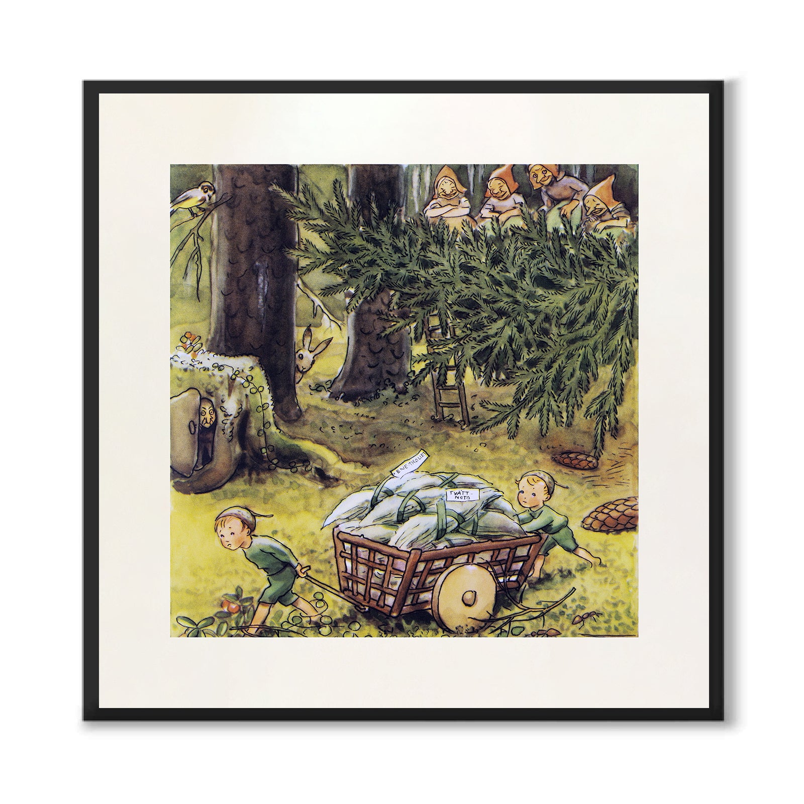 In this illustration we see Ocke and Pillerill pulling a large cart filled with bundles of beard licorice that the trolls have packed up for delivery to their friends and customers. On notes we see, among other things, that a bundle of beard moss is to be delivered to the Ene troll. In the background we find many small spectators. Four elves are sitting on a branch above, a hare peeking out from behind a tree, an old woman peeking out from a stump and a small bird on a branch.