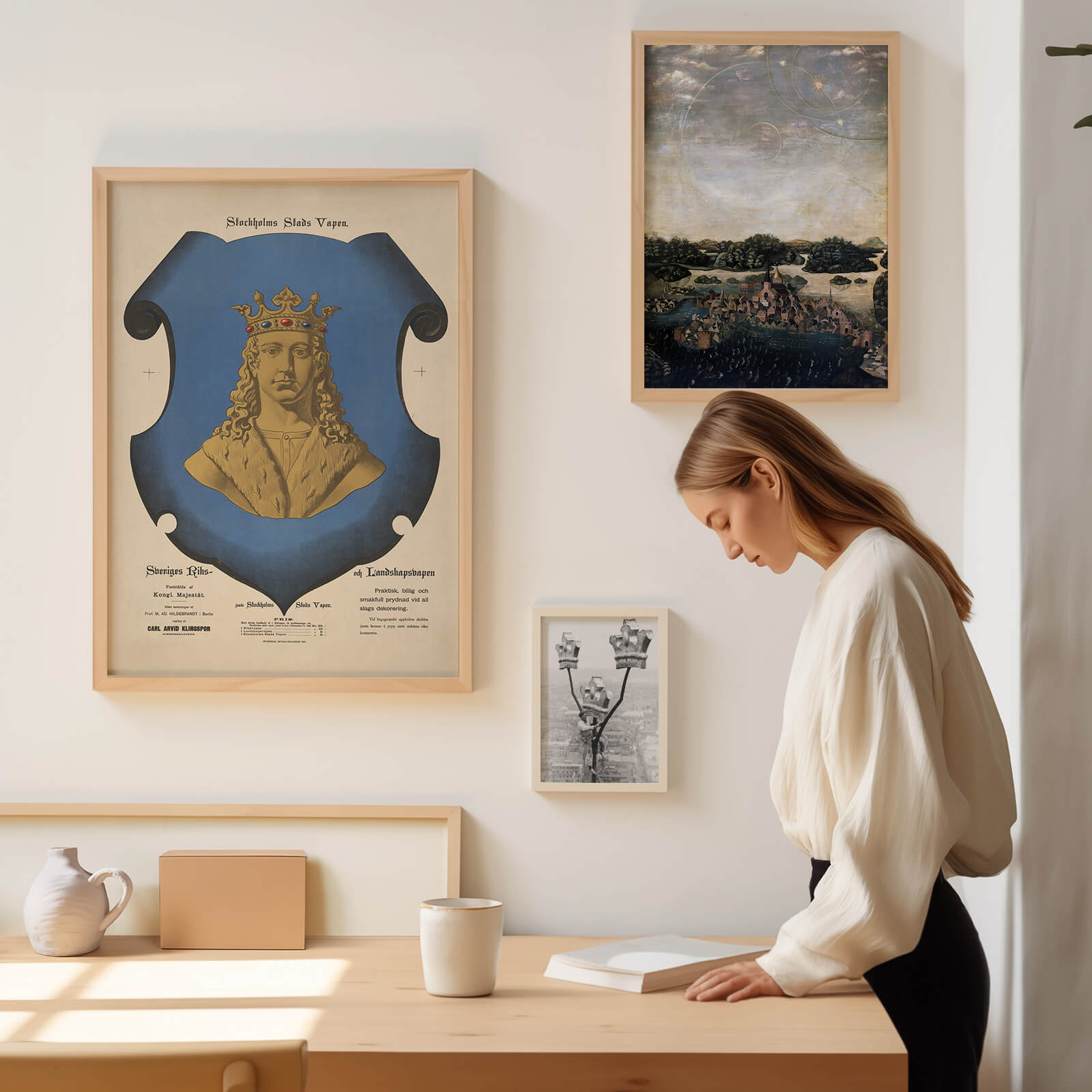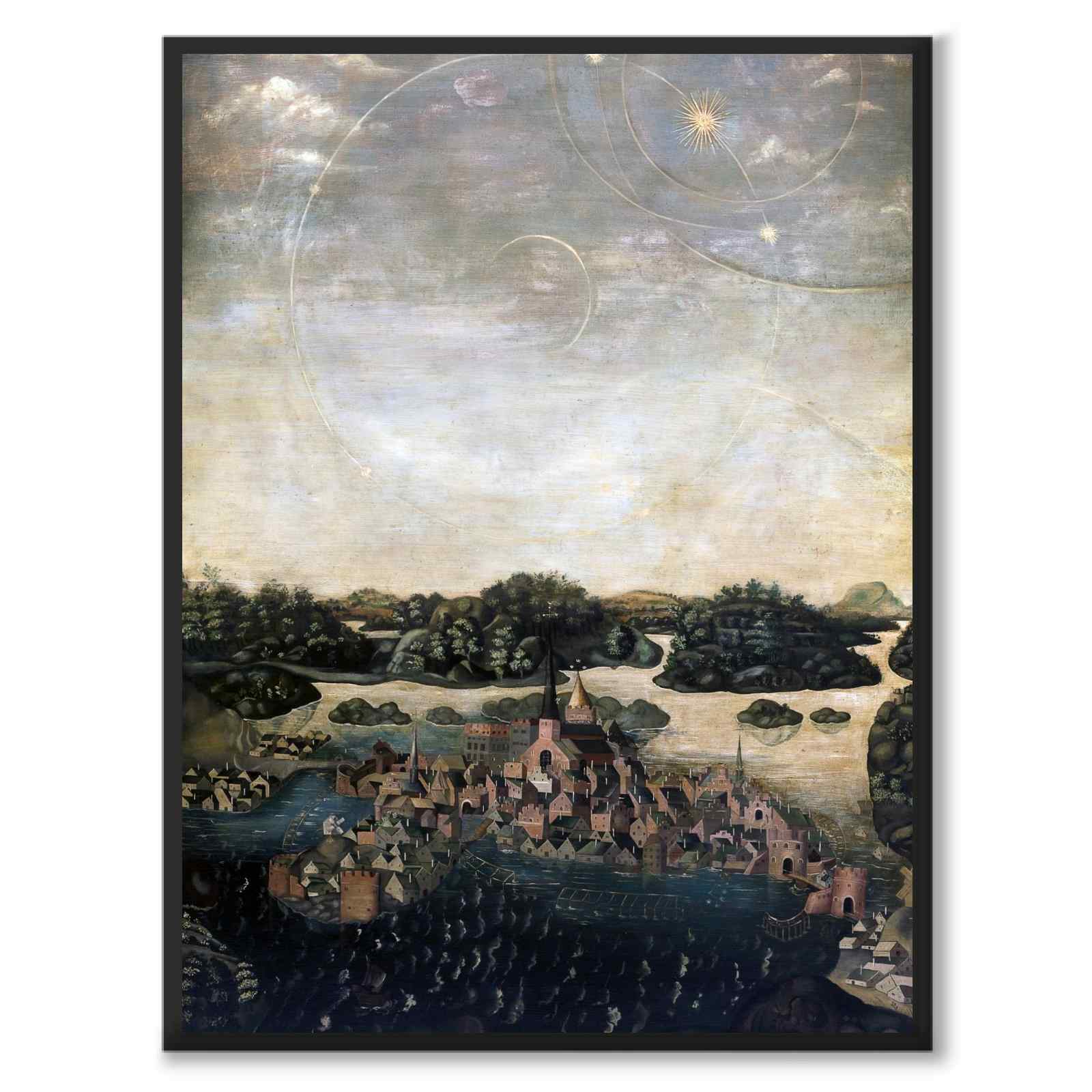 Poster with the weather vane, which is one of the oldest known images of Stockholm from 1535 (recreated in 1931). The painting shows how Stockholm looked during the latter part of the Middle Ages as seen from Söder's heights.