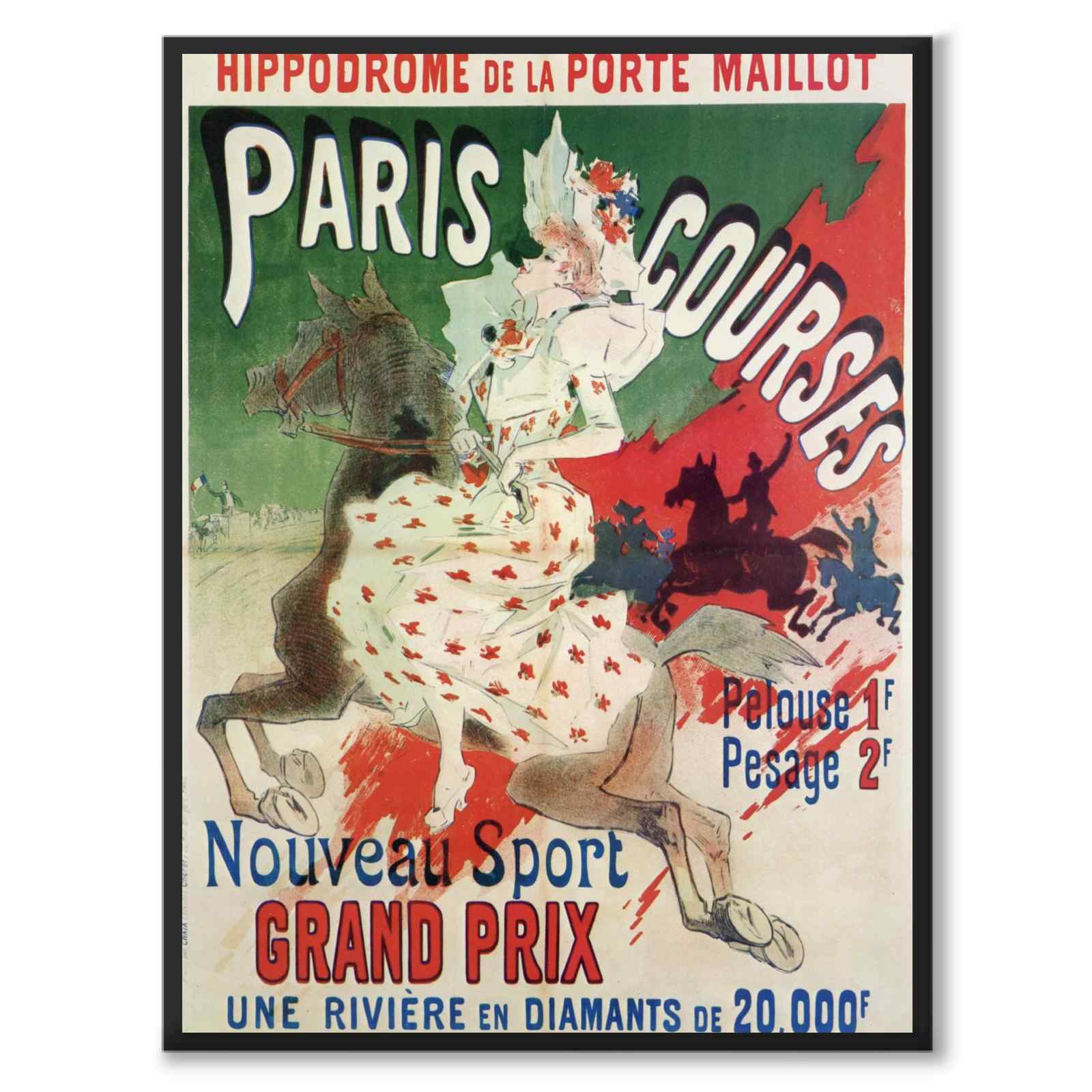 The poster Paris Courses promoted a performance at the Hippodrome de Paris, a popular entertainment venue that featured circus, acrobatics, and other spectacular acts. The image depicts a woman in a white and red polka-dotted dress riding a horse. In the background, figures of several people riding horses can be seen, seemingly illustrating a competition.