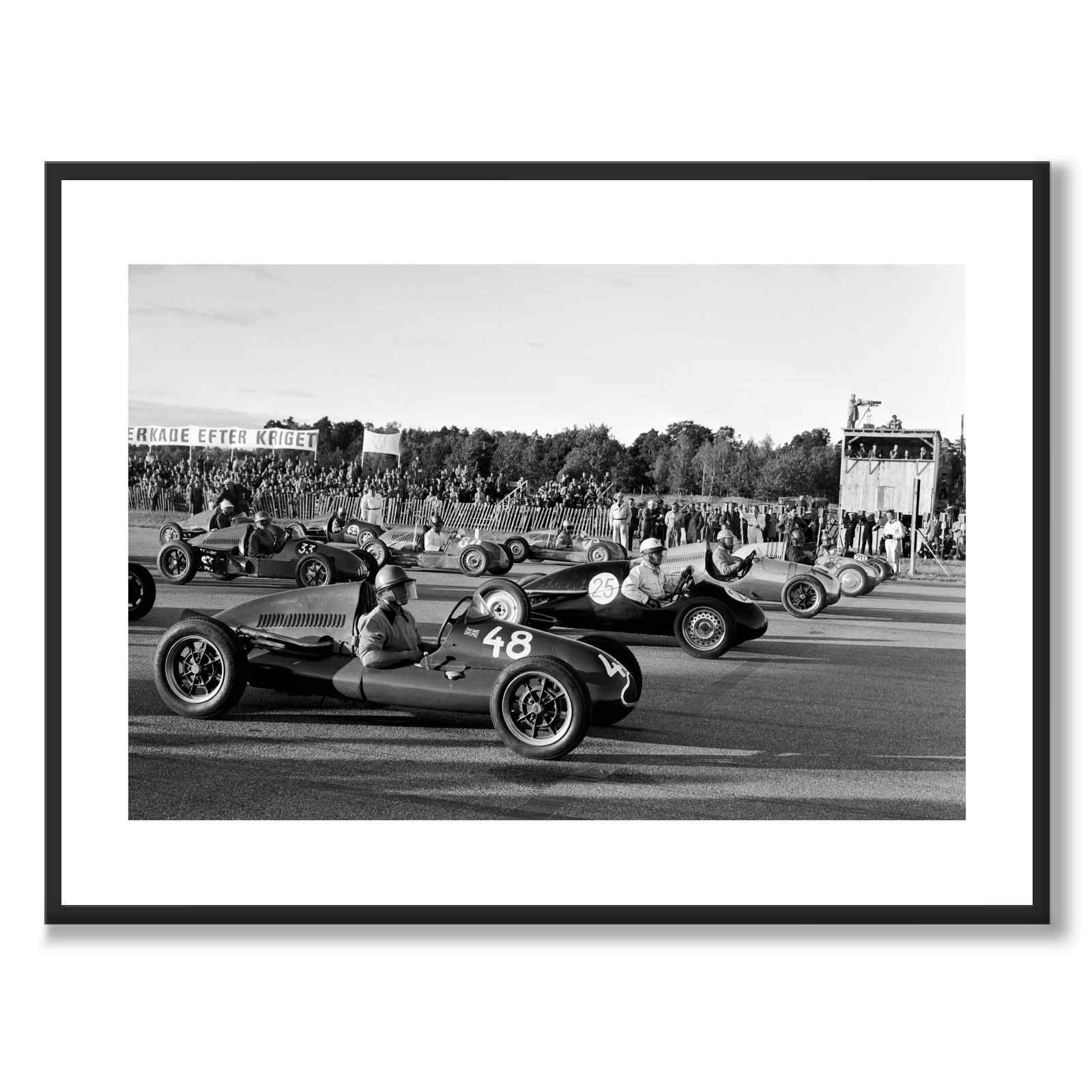 The Skarpnäcksloppet motor race in Stockholm 1952. The cars are lined up at the starting line ready to race.