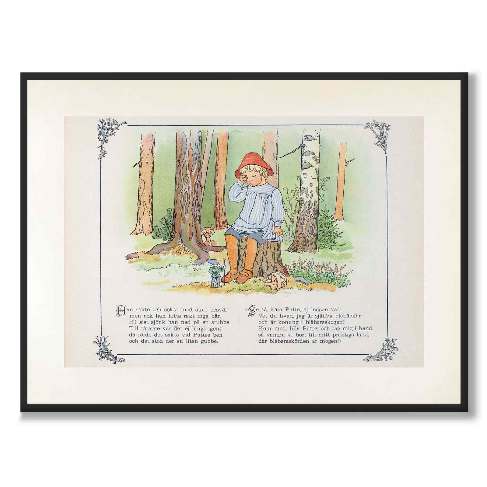 Poster with an illustration from Putte's Adventures in the Blueberry Forest, a beloved Swedish children's book written and illustrated by Elsa Beskow, from the year 1901. It is one of Beskow's most famous works and is considered a classic in Swedish children's literature.