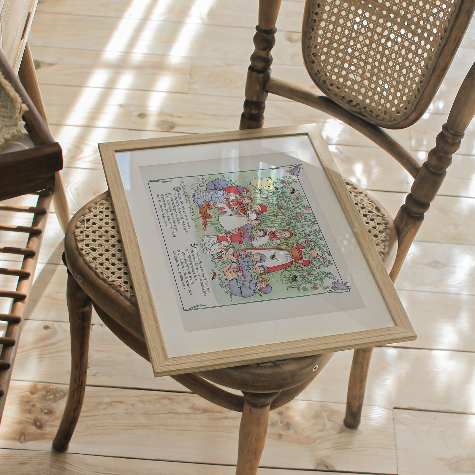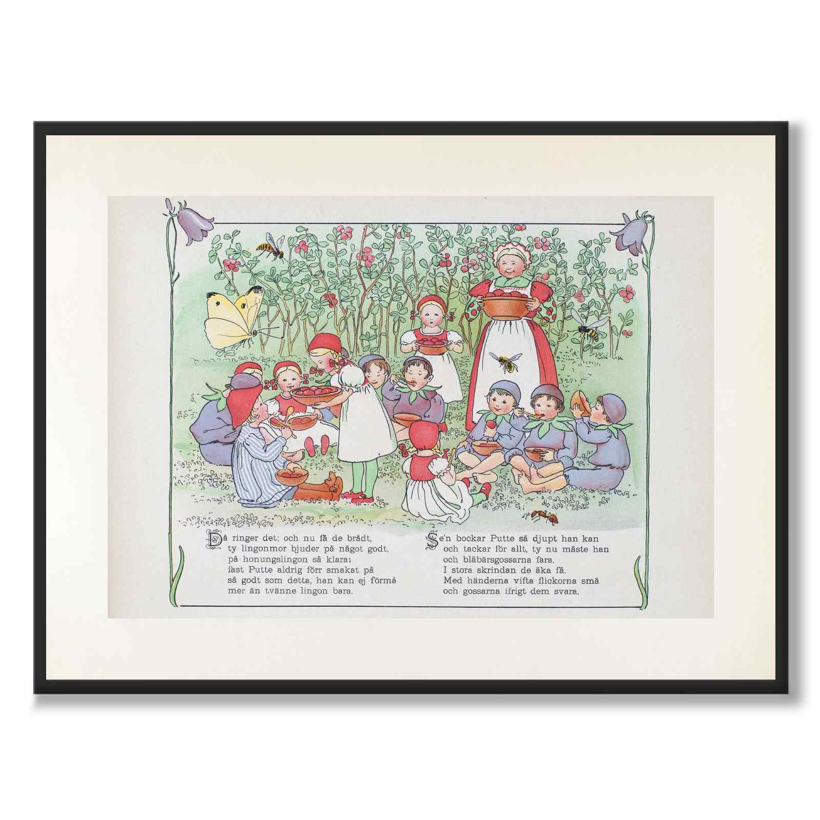 Poster with an illustration from Putte's Adventures in the Blueberry Forest, a beloved Swedish children's book written and illustrated by Elsa Beskow, from the year 1901. It is one of Beskow's most famous works and is considered a classic in Swedish children's literature.