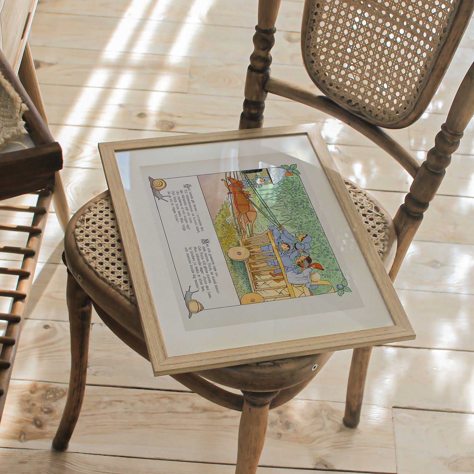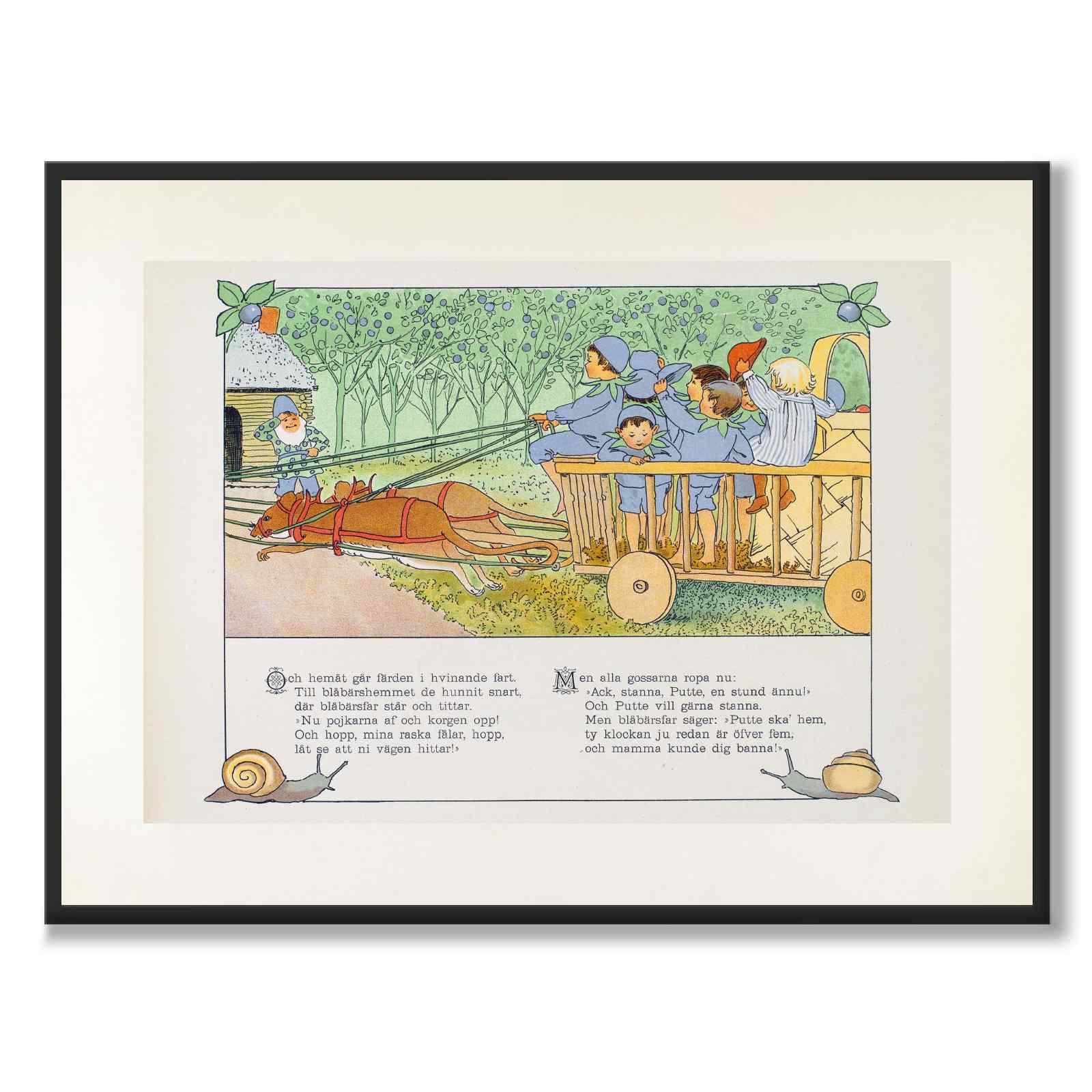 Poster with an illustration from Putte's Adventures in the Blueberry Forest, a beloved Swedish children's book written and illustrated by Elsa Beskow, from the year 1901. It is one of Beskow's most famous works and is considered a classic in Swedish children's literature.