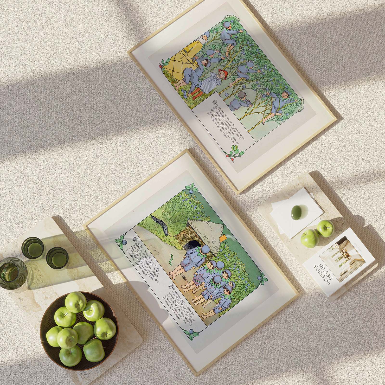 Poster with an illustration from Putte's Adventures in the Blueberry Forest, a beloved Swedish children's book written and illustrated by Elsa Beskow, from the year 1901. It is one of Beskow's most famous works and is considered a classic in Swedish children's literature.