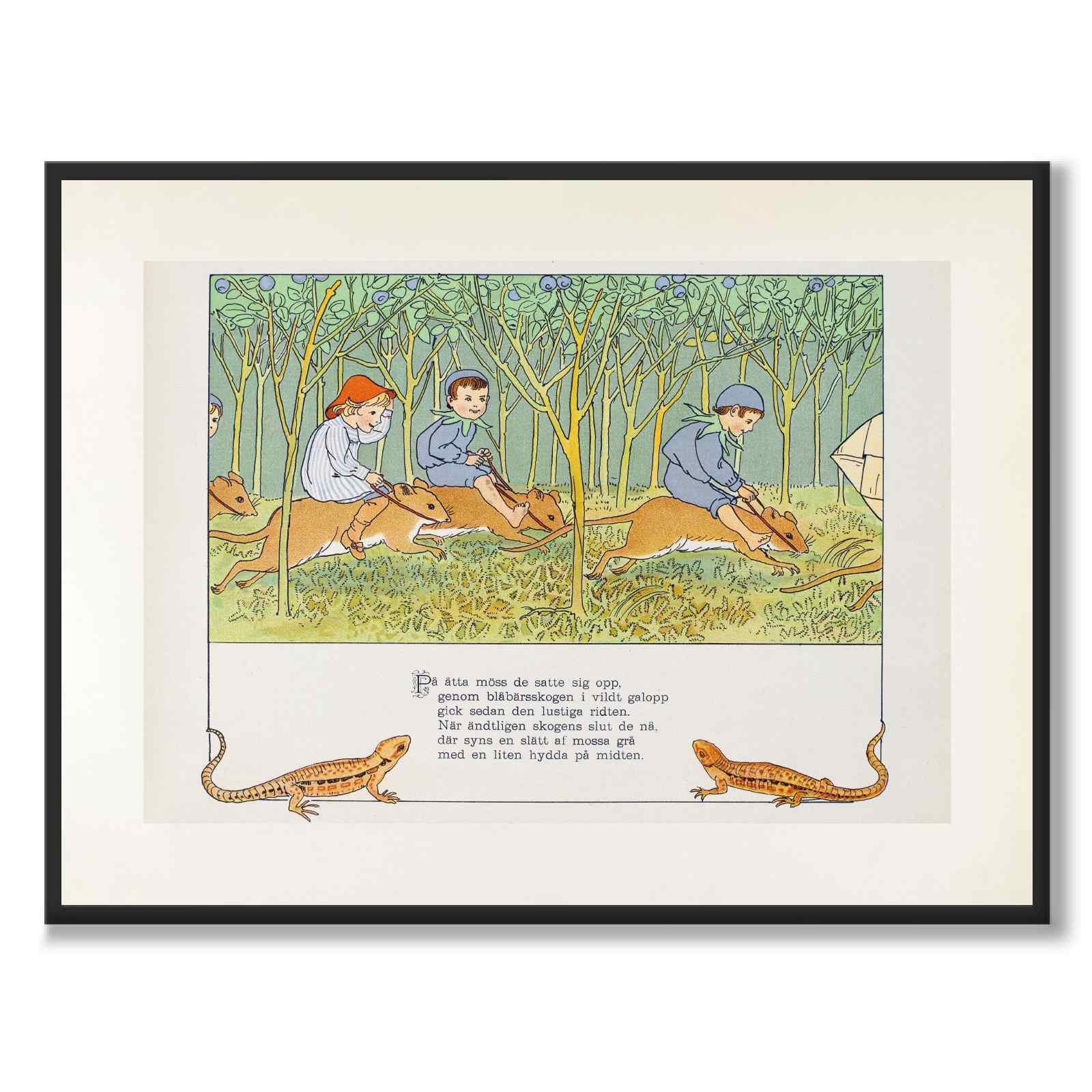 Poster with an illustration from Putte's Adventures in the Blueberry Forest, a beloved Swedish children's book written and illustrated by Elsa Beskow, from the year 1901. It is one of Beskow's most famous works and is considered a classic in Swedish children's literature.