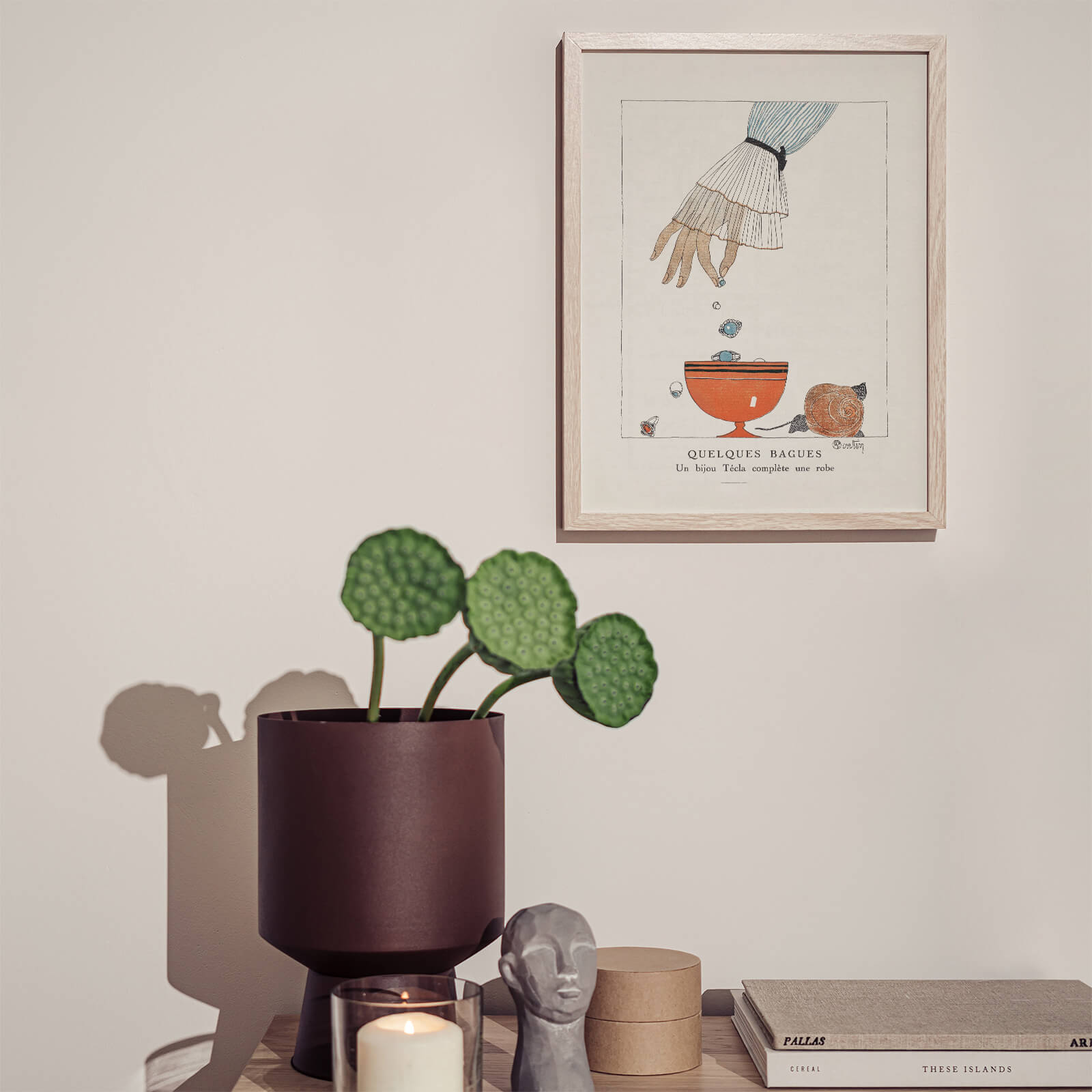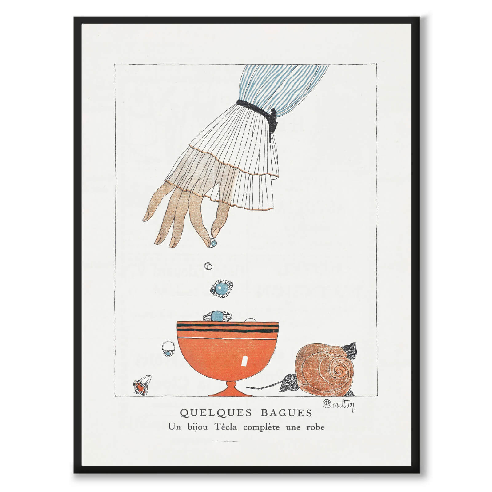 Poster with an old French advertisement for rings with jewels by Charles Martin from 1914. On the illustration you see the text Quelques Bagues. Un bijou Técla complète une robe. The picture shows a woman's hand dropping beautiful rings into a jewelry cup.