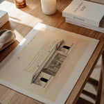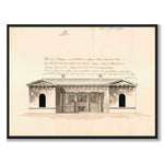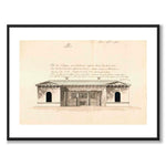 The poster shows a drawing of a temple-like gazebo on Regeringsgatan in Stockholm from 1795, designed by architect Per Estenberg. Estenberg was a prominent Swedish architect who had worked for eleven years as a student of the French architect Louis Jean Deprez, which influenced his design and style.