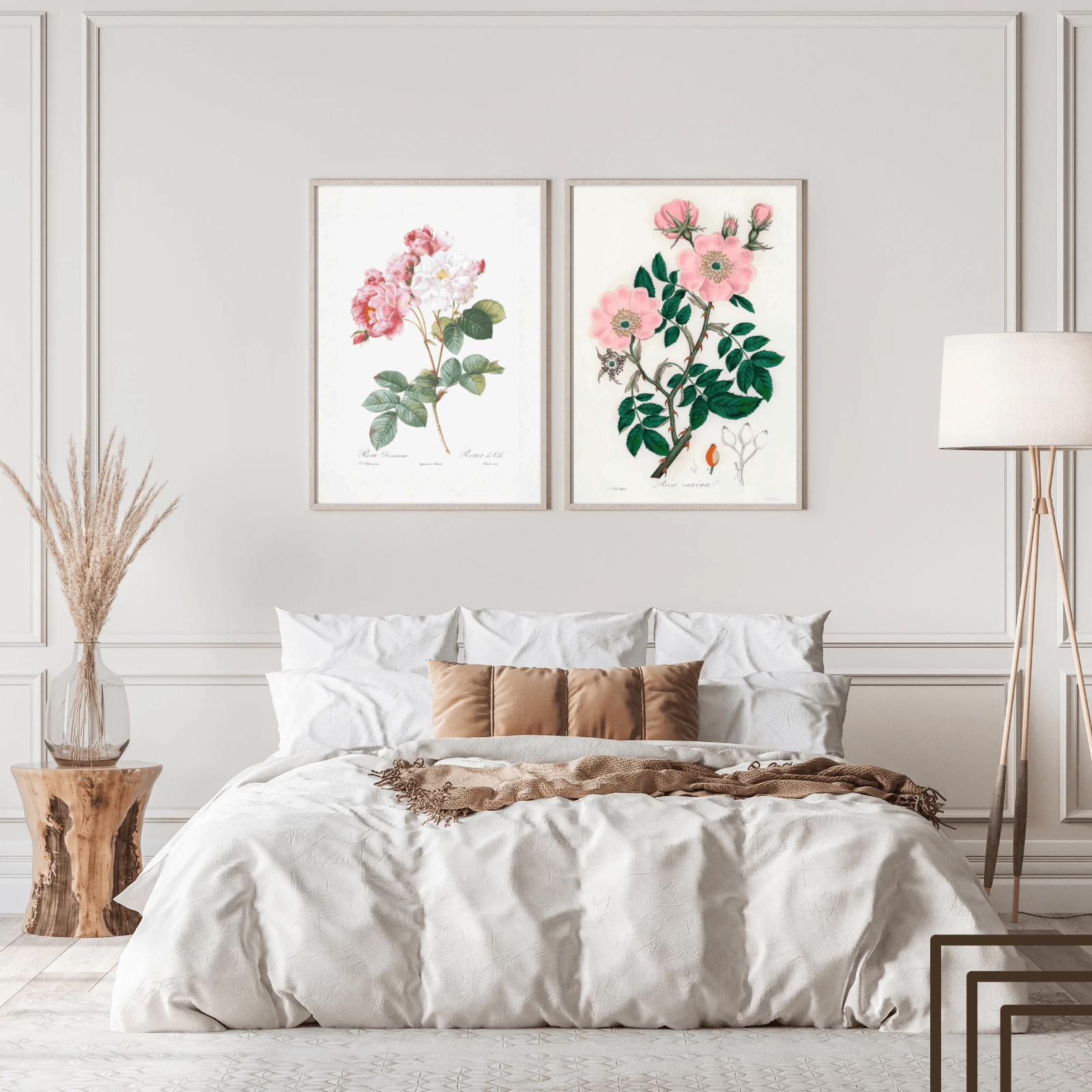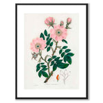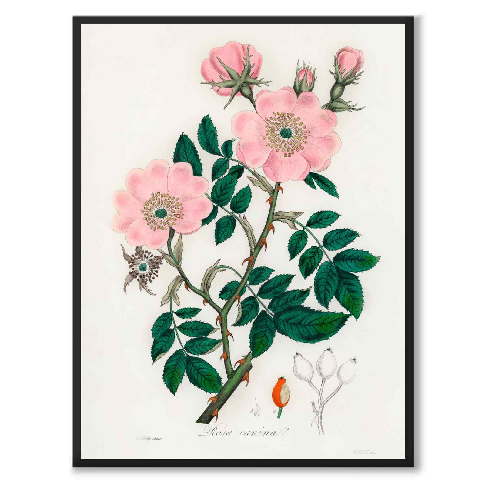 Poster with motif of the illustration Rosa caninal. Rosa canina, also known as dog rose, plays an important role in the ecosystem as habitat and food for many animal species. Its flowers attract pollinators such as bees and butterflies, while its fruits are an important food for birds and other animals.