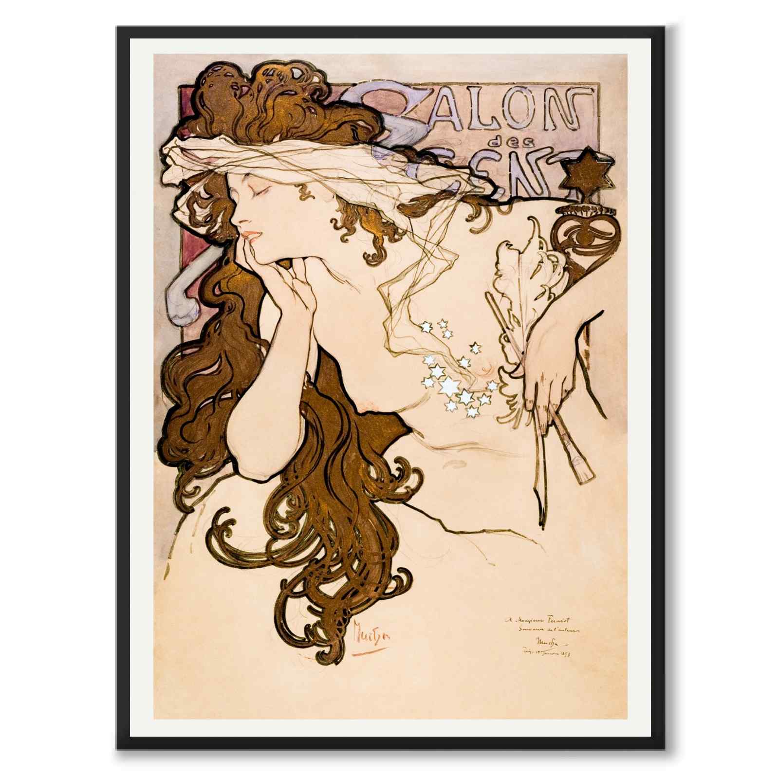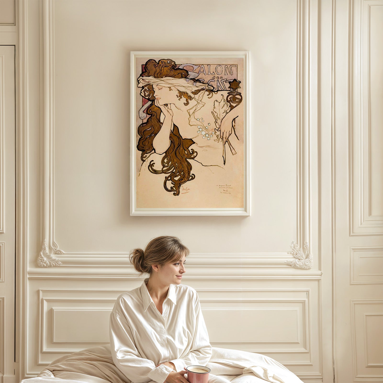 Post with the poster "Salon des Cents" off Alphonse Mucha (1860-1939) from 1897. The poster was created for the Salon des Cent, an art exhibition held in Paris. The image shows a woman in a relaxed and dreamy pose. She wears a simple clothing style and has a long flowing hair.