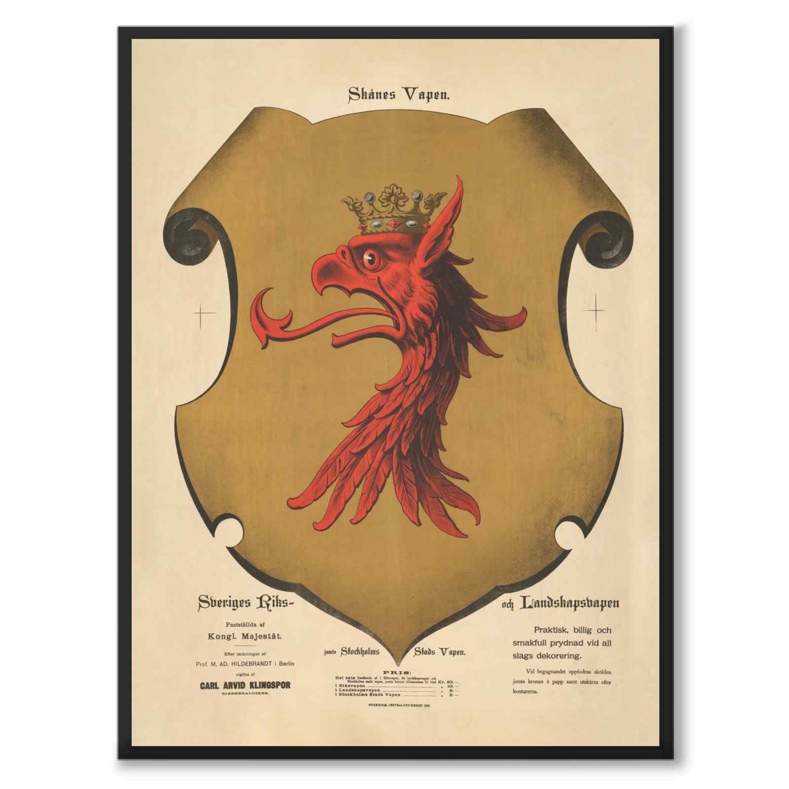 The text above the coat of arms reads: "Crest of Skåne". At the bottom left it says: "Sweden's National and Country Coat of Arms. Established by the Royal Majesty. After drawings by Prof. M. AD. Hildebrandt in Berlin. Published by Carl Arvid Klingspor."
