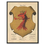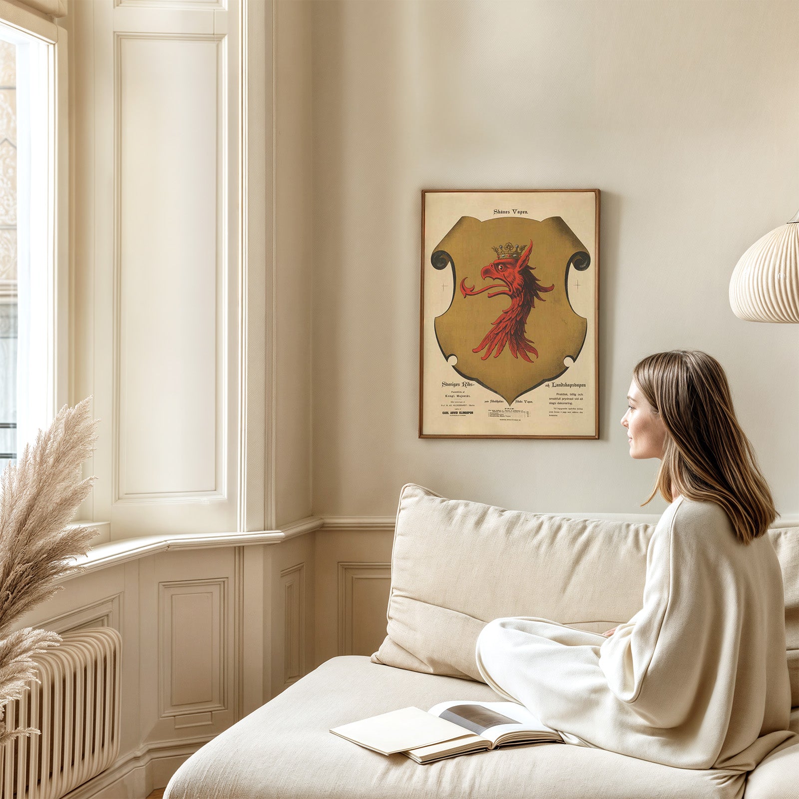 A beautiful drawing with the heraldic coat of arms for the province of Skåne from the 19th century. The weapon features a red grappling head against a gold shield.