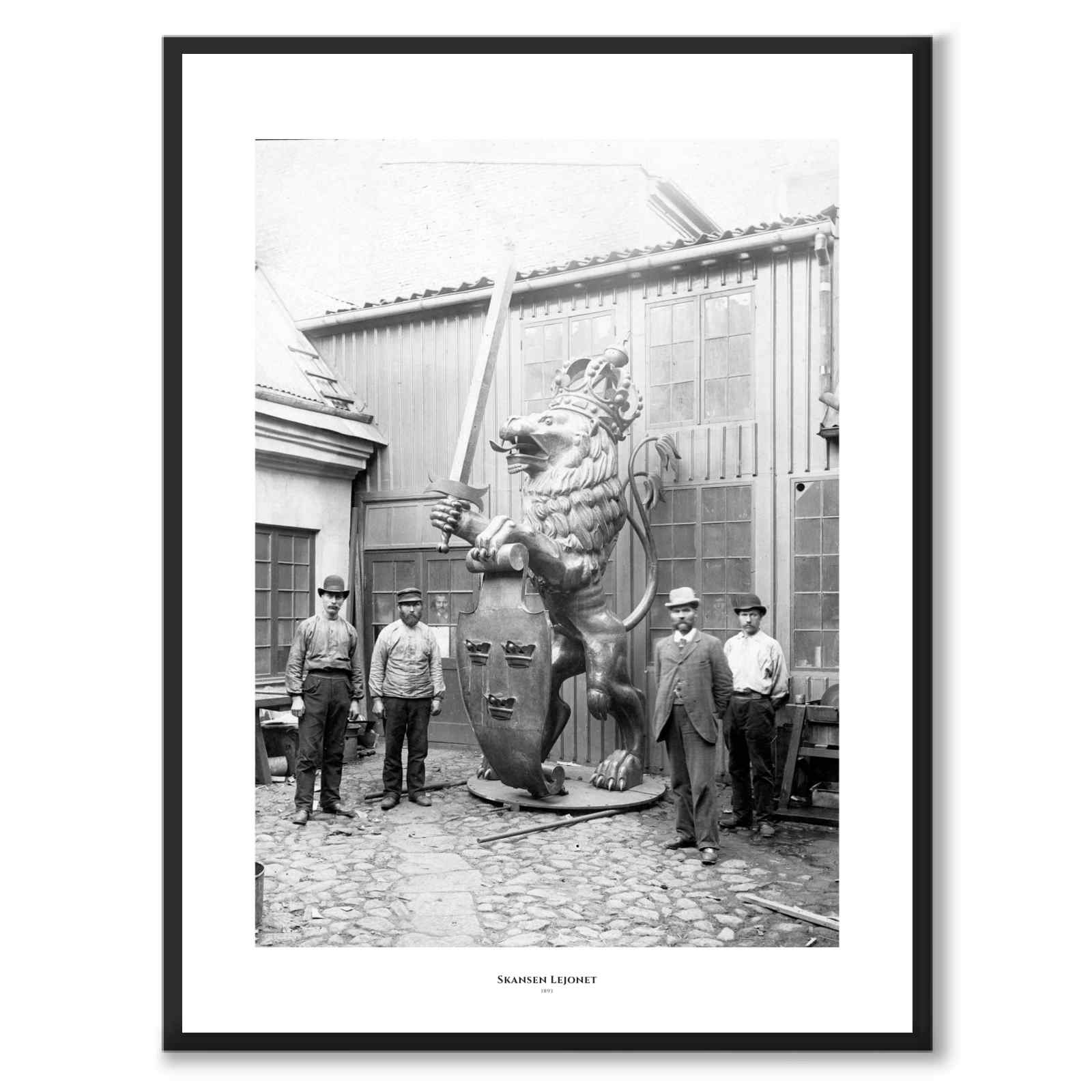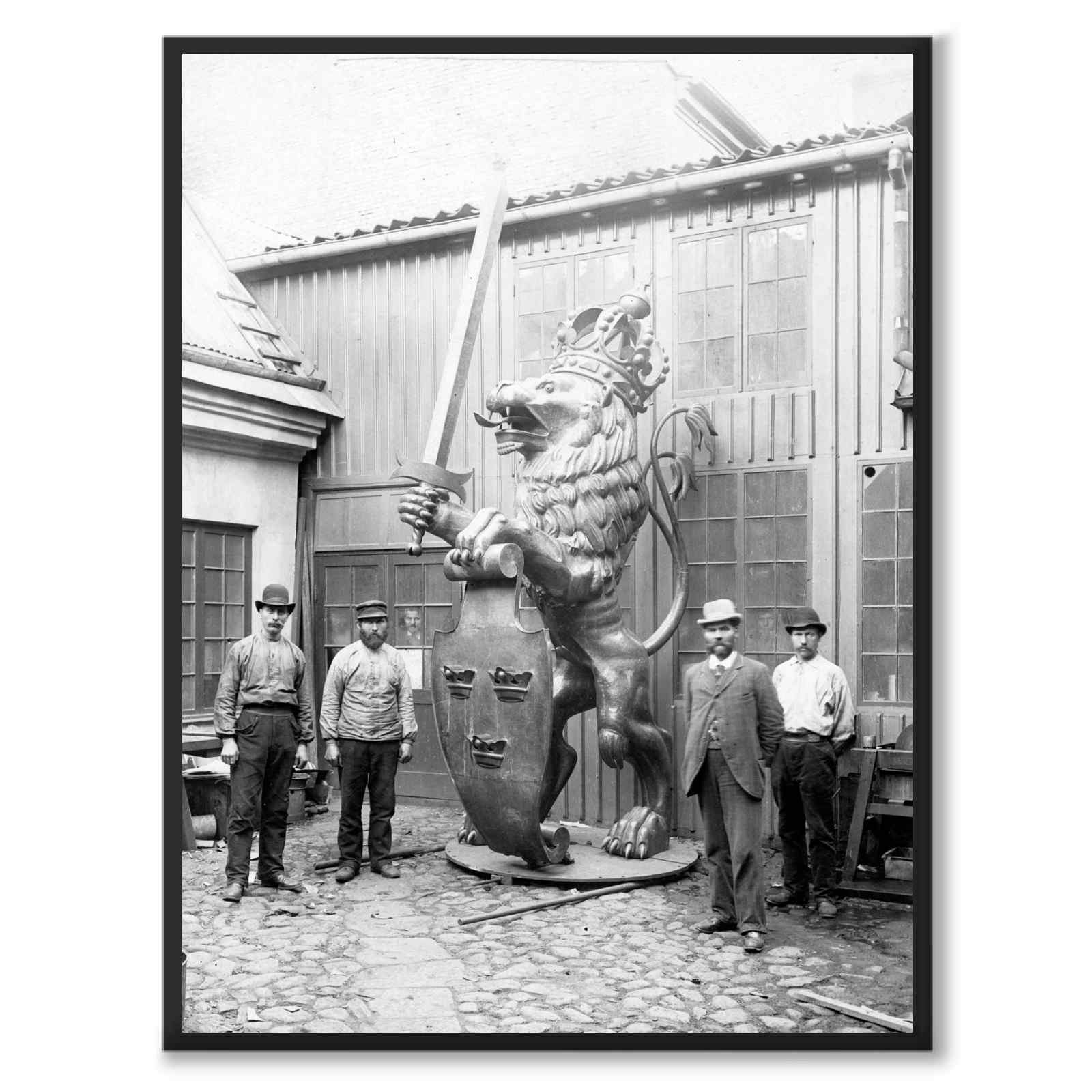 Poster with a unique photograph of the crest of Skansen Lejonet, taken in September 1893. The photo is from Bleck- & Plåtslageribolaget's farm, Sillgatan 7 in Gothenburg. On the sides of the lion stands Simon Olsson in a light hat and suit with the workers Karl Karlberg, Svantesson and Axel Svensson.