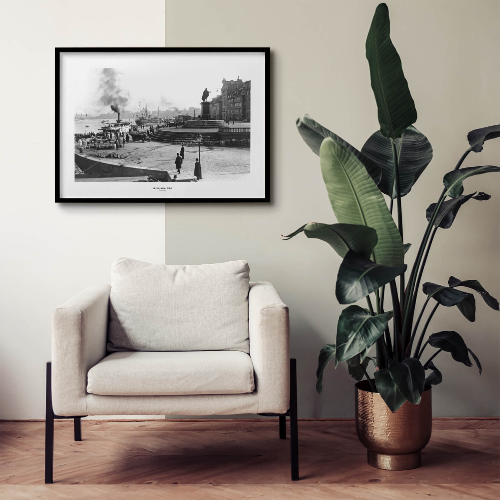 Poster with a detailed picture from 1909 of the Skeppsbron in Gamla Stan. At the round quay which is the site of the Gustafsberg boats, the shipping company's new acquisition, the cargo steamer Gustafsberg IV can be seen burning properly in the boiler. In the background can be seen the accident-stricken Gotland boat Hansa, which sank in 1944 with 84 deaths.