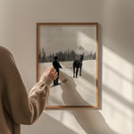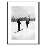 Poster with a photograph of a wintry Norwegian landscape. Cadet Haneborg cross-country skiing behind a horse across the snow in January 1903.