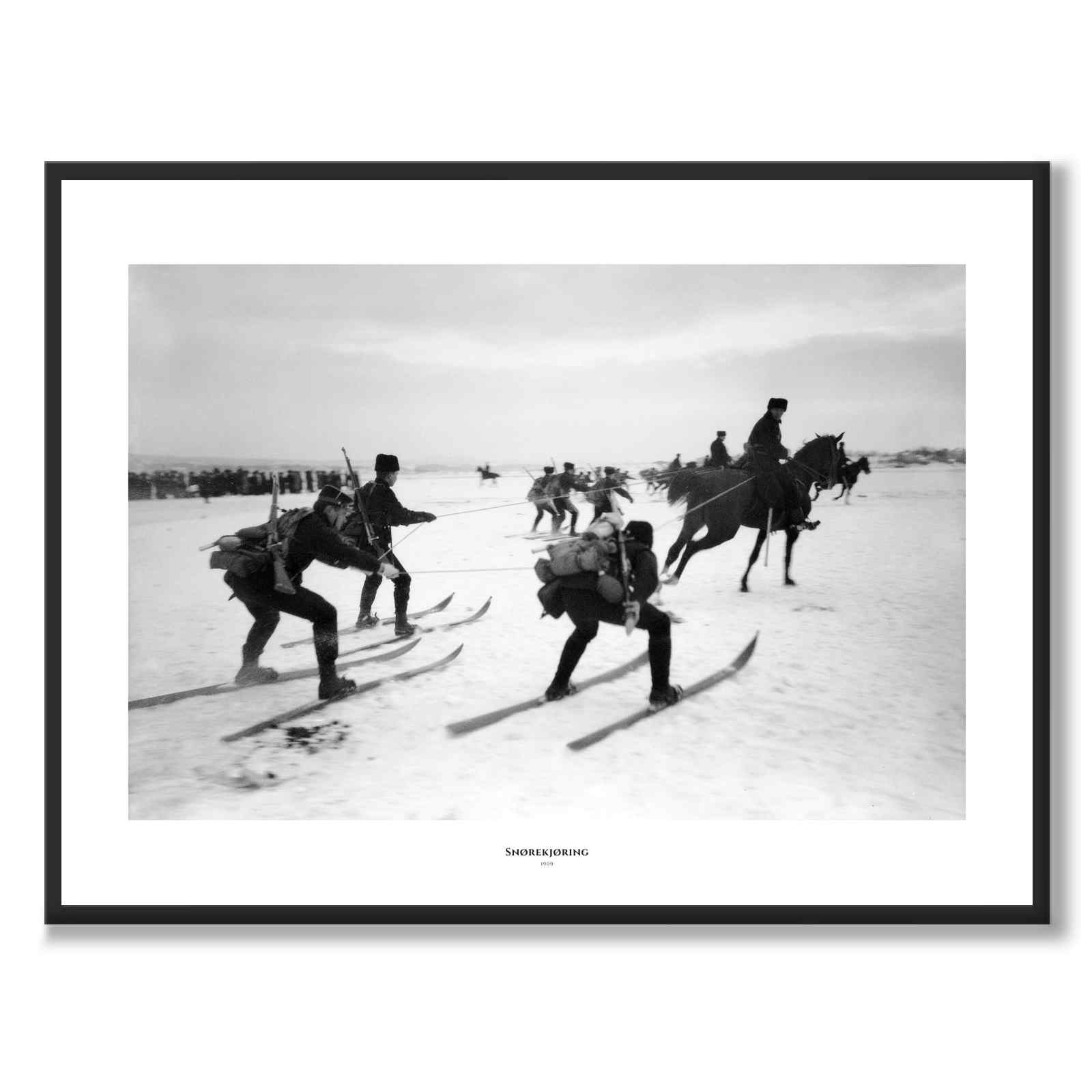 Poster med ett fotografi "Snørekjøring" som fångar en grupp soldater som åker skidor i snön och blir dragna av hästar. Detta är en typisk scen för "snörekörning".