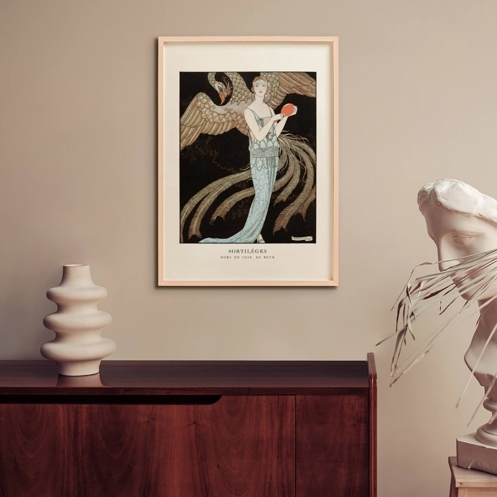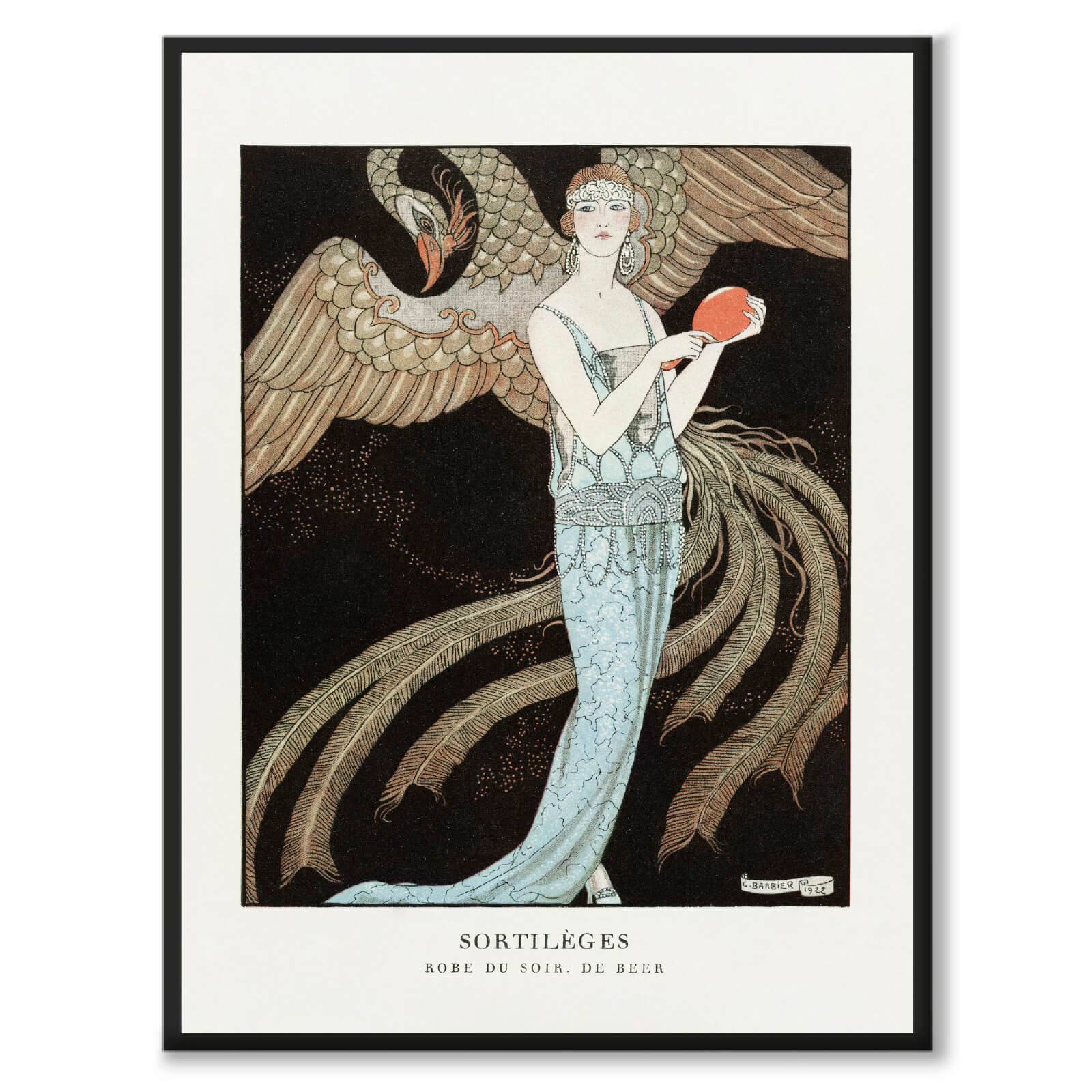 Poster with an illustration from a French fashion magazine in 1922. On the illustration you see the text Sortilèges: Robe du Soir, de Beer - French for Spells: Evening Dress by Beer .