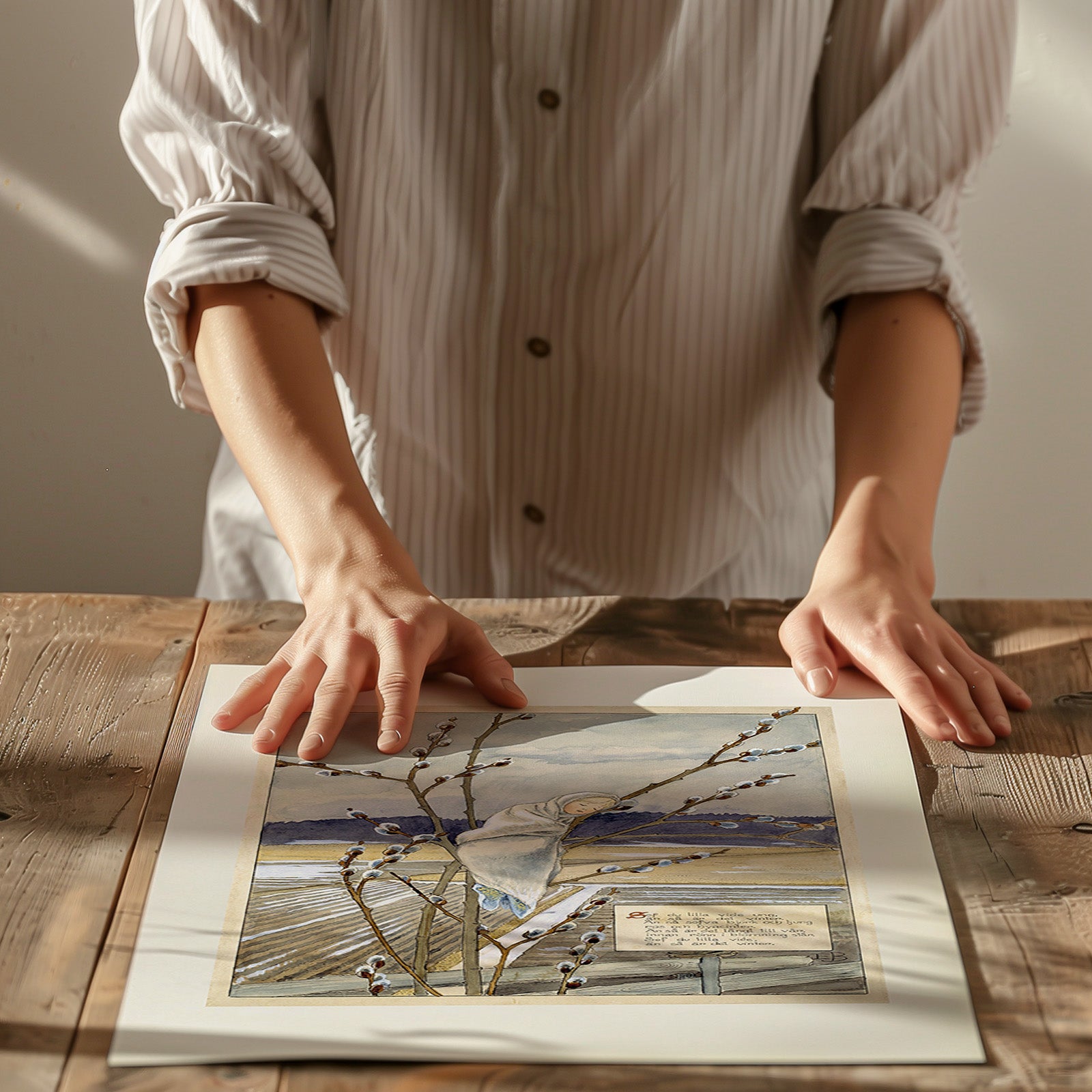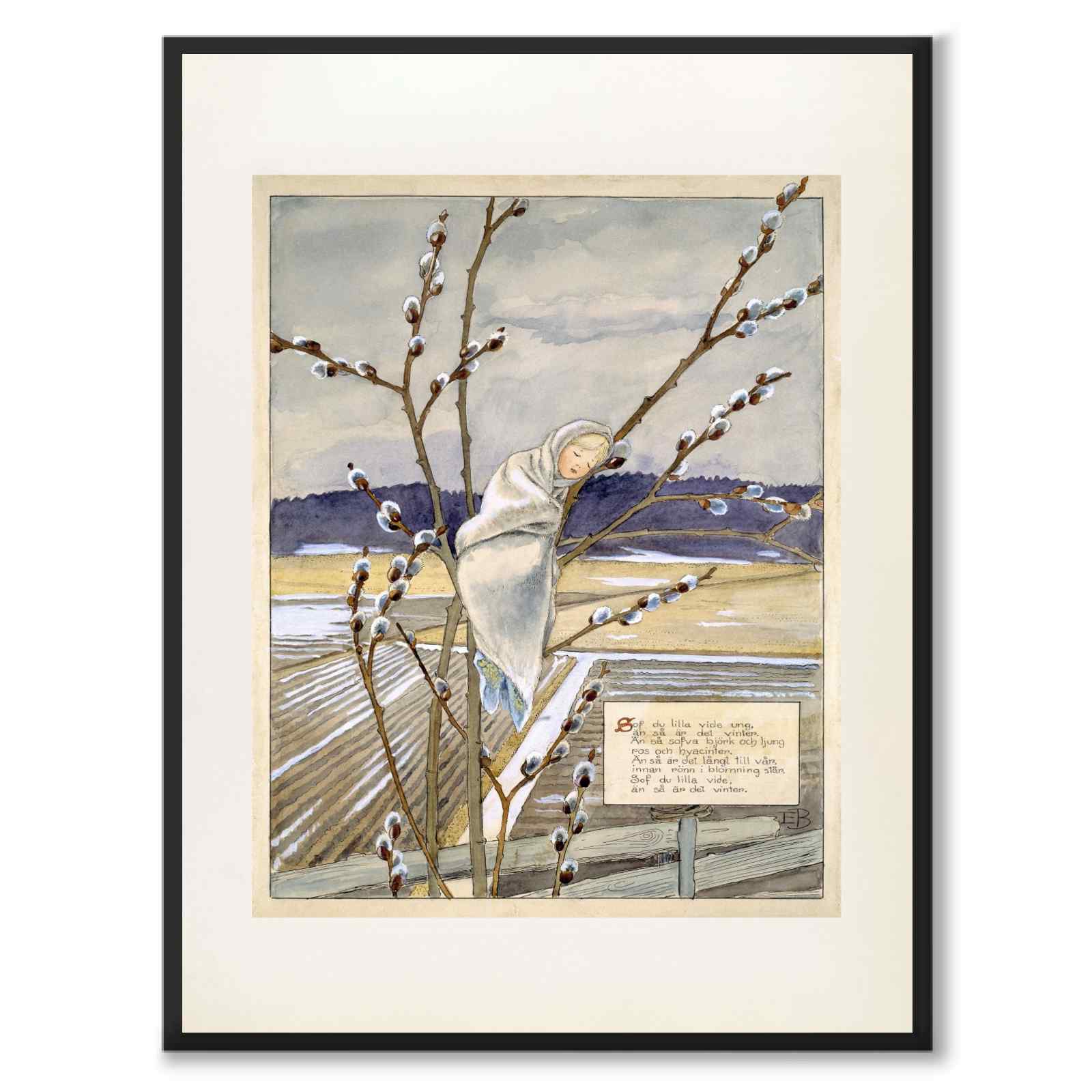 A nostalgic poster featuring the classic poem and lullaby Sleep you little willow young illustrated by Elsa Beskow from the early 20th century.