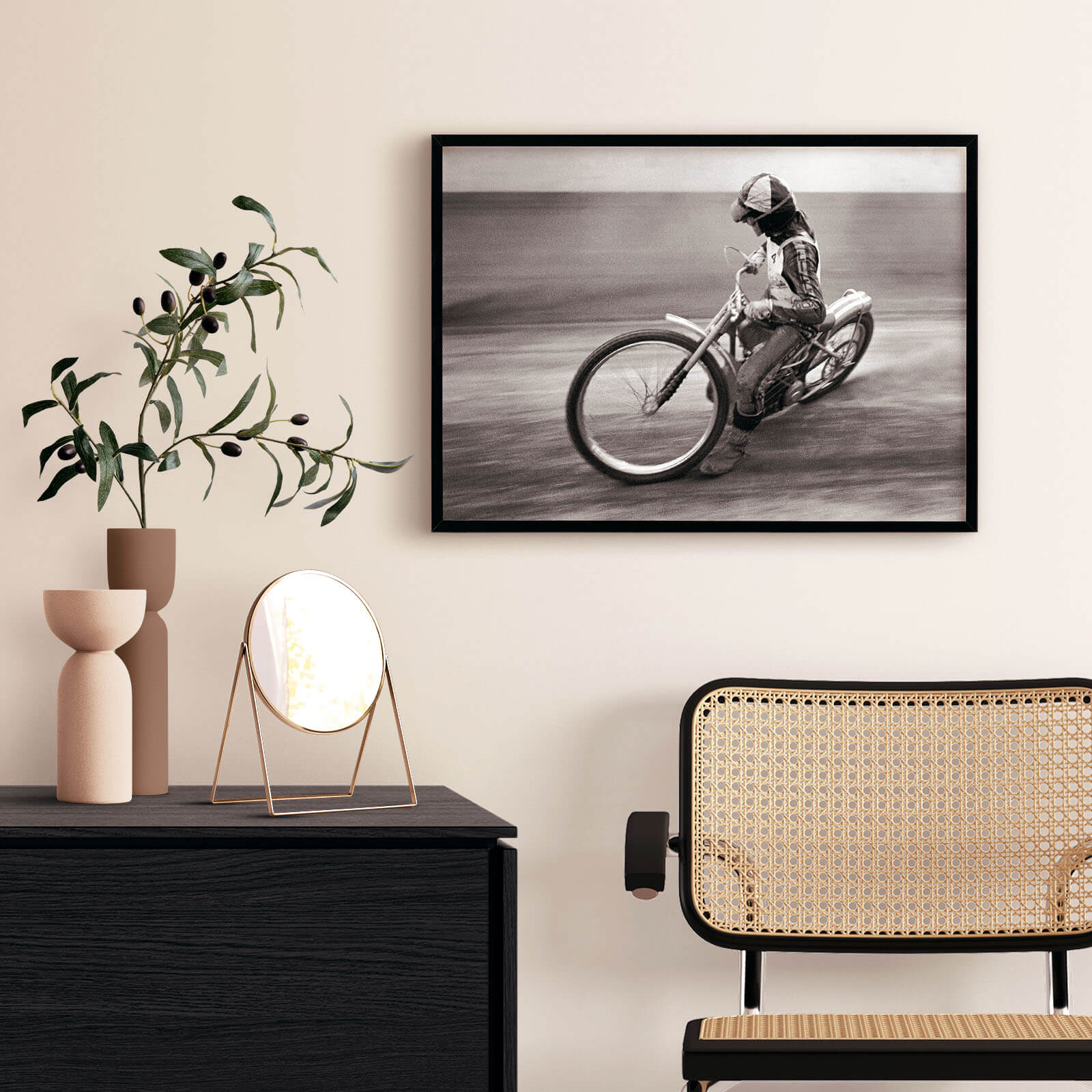 Poster with a picture from one Speedway competition in the 1970s. A speedway rider for the Wasps lies in a curve on the track and the stubble sprays from the rear wheel.