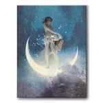 In this fairy-tale painting we see a woman and a child standing on a moon. The woman can be interpreted as Spring , which consequently spreads its stars.
