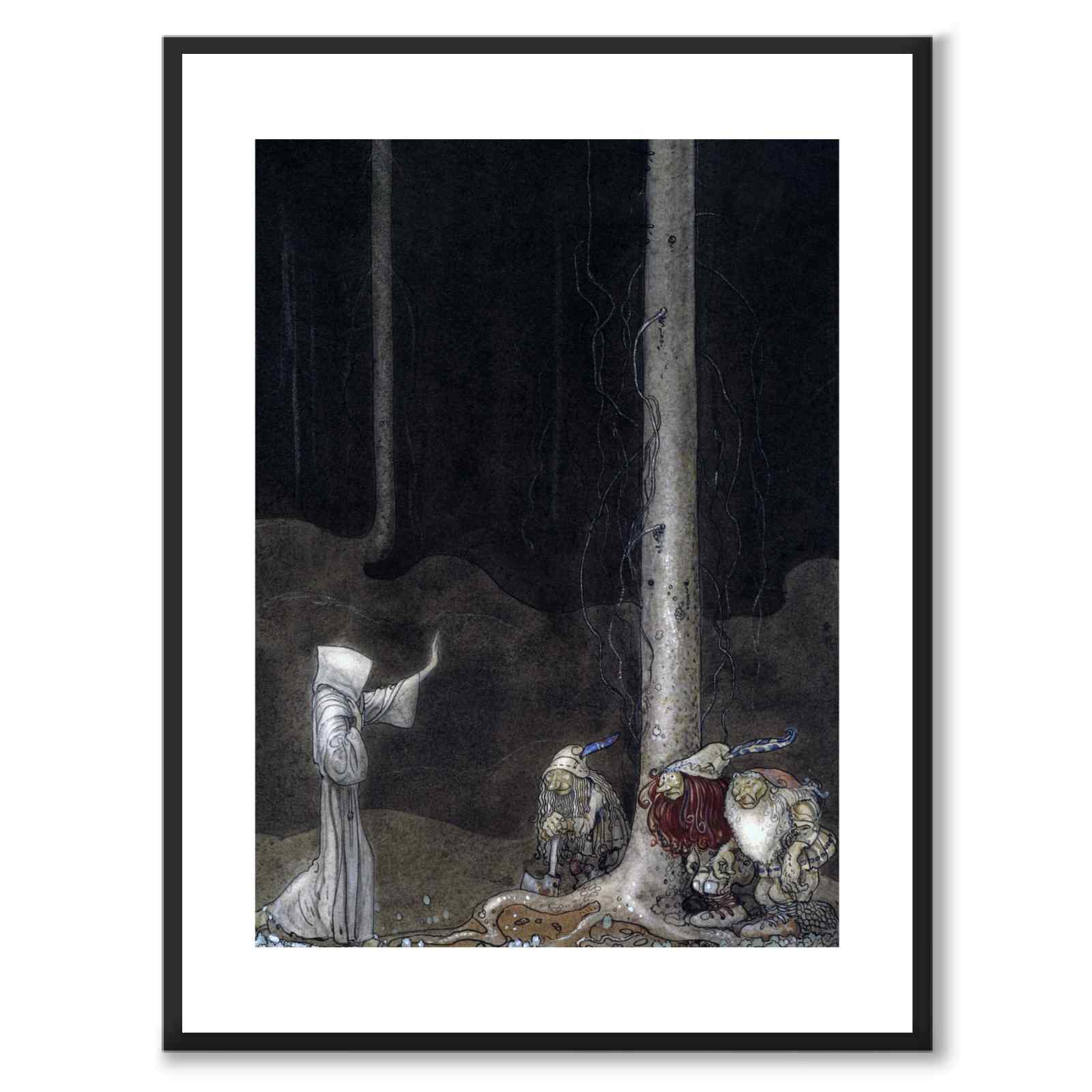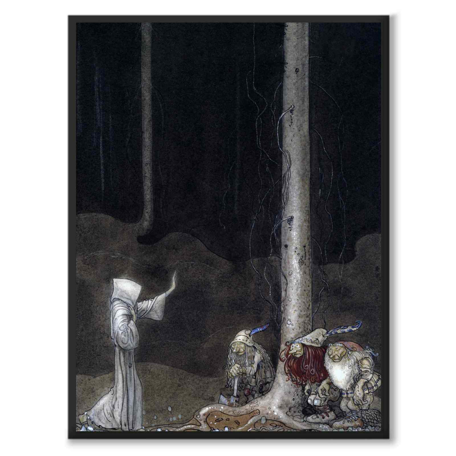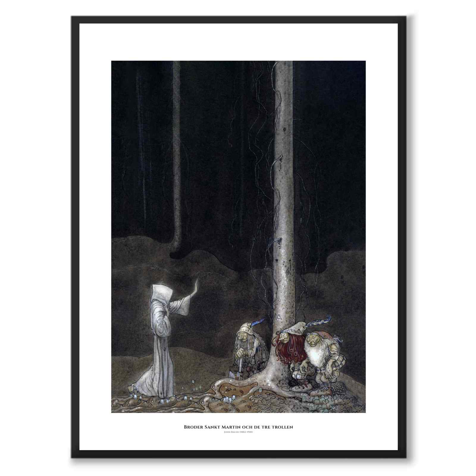 Brother Saint Martin and the Three Goblins is a famous painting by John Bauer. The picture was first published together with a fairy tale in Among Elves and Goblins in 1913 . The story is about the monk Sankt Martin who has gone from Sigtuna to Bergslagen to tell about the god he believes in. But the people there would not listen. On the way home, he got lost in the forest and met goblins, fairies and other beings in the deep, dark forest. In the picture we see him wearing his hood holding up a hand against three trolls.