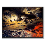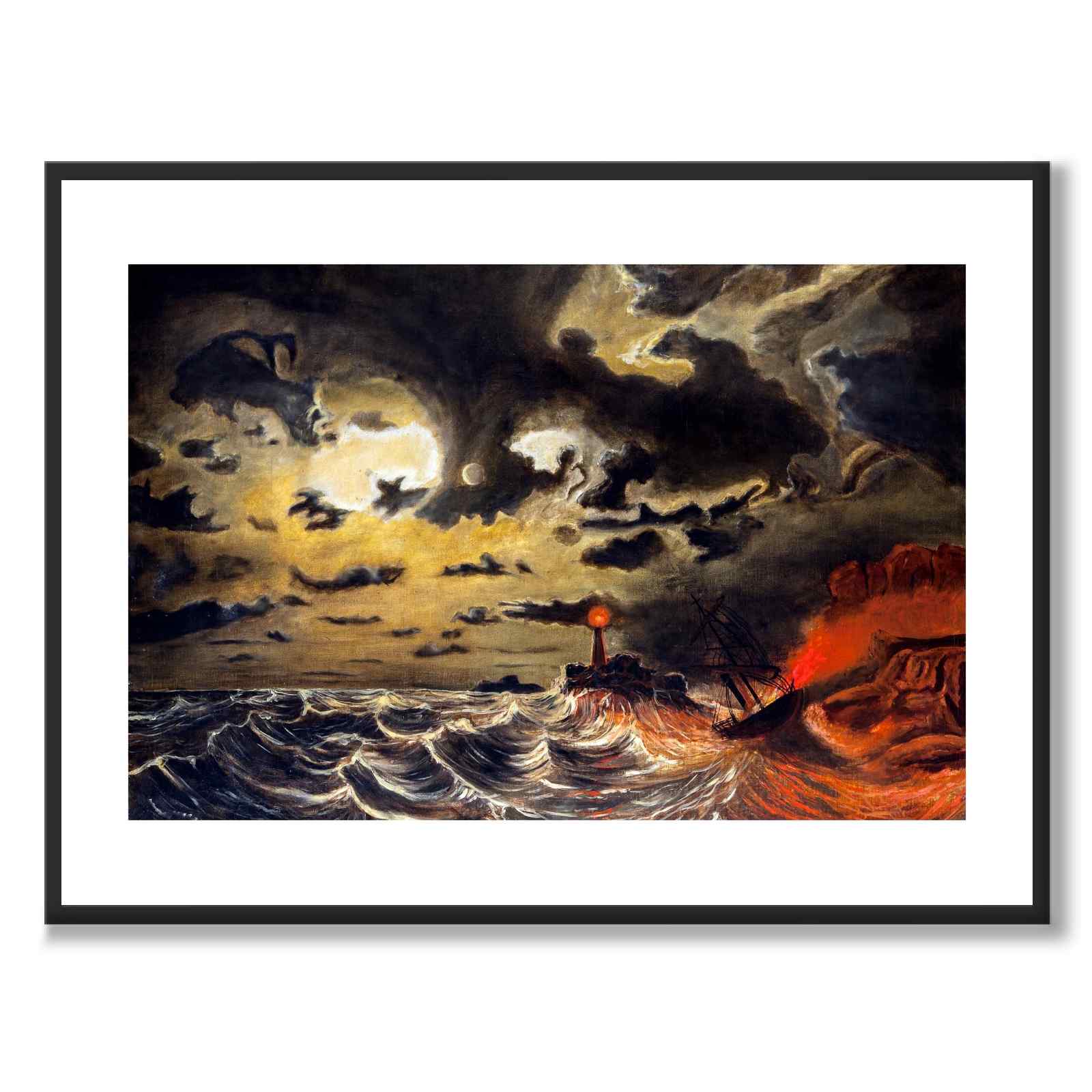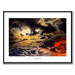 Poster with the beautiful painting Steamer in flames, or Brinnande ångbåt in Swedish. The painting was created in the middle of the 19th century by Marcus Larson, a Swedish painter.
