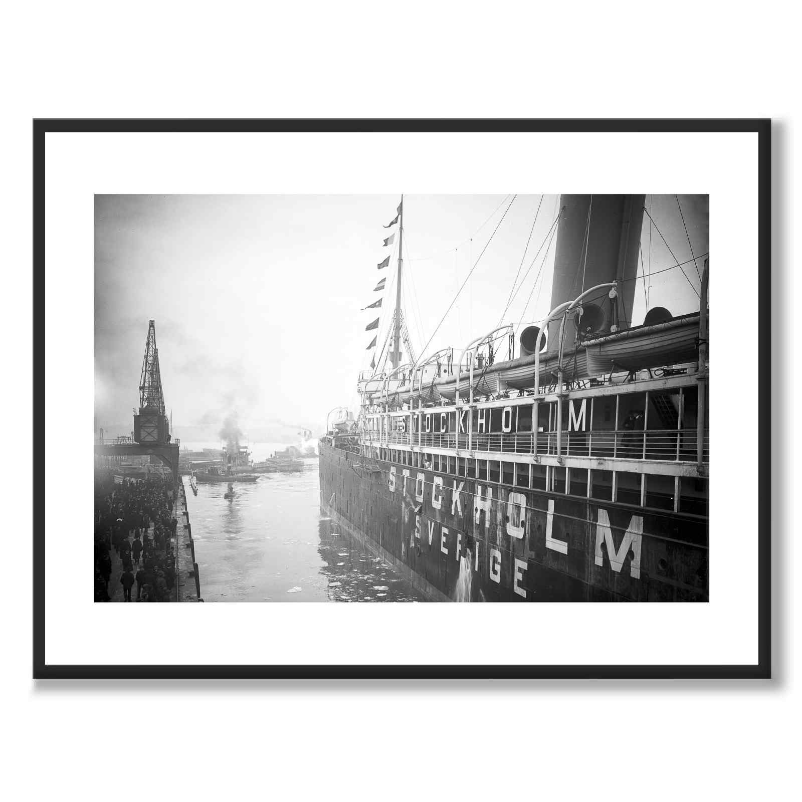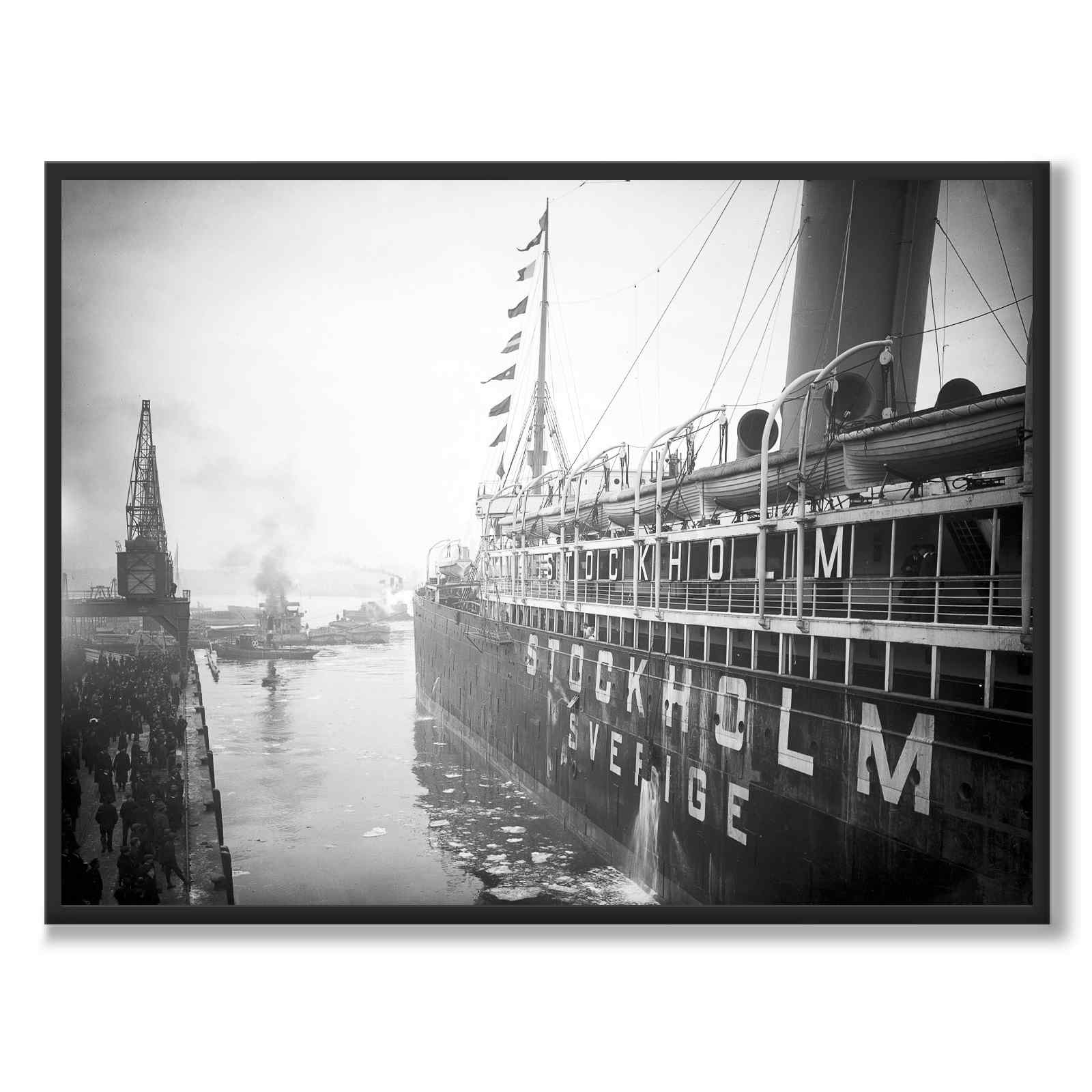 Poster with the beautiful ship STOCKHOLM in the port of Gothenburg. The ship is painted in the neutrality designation for Swedish naval vessels. The photograph was taken around 1915.