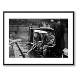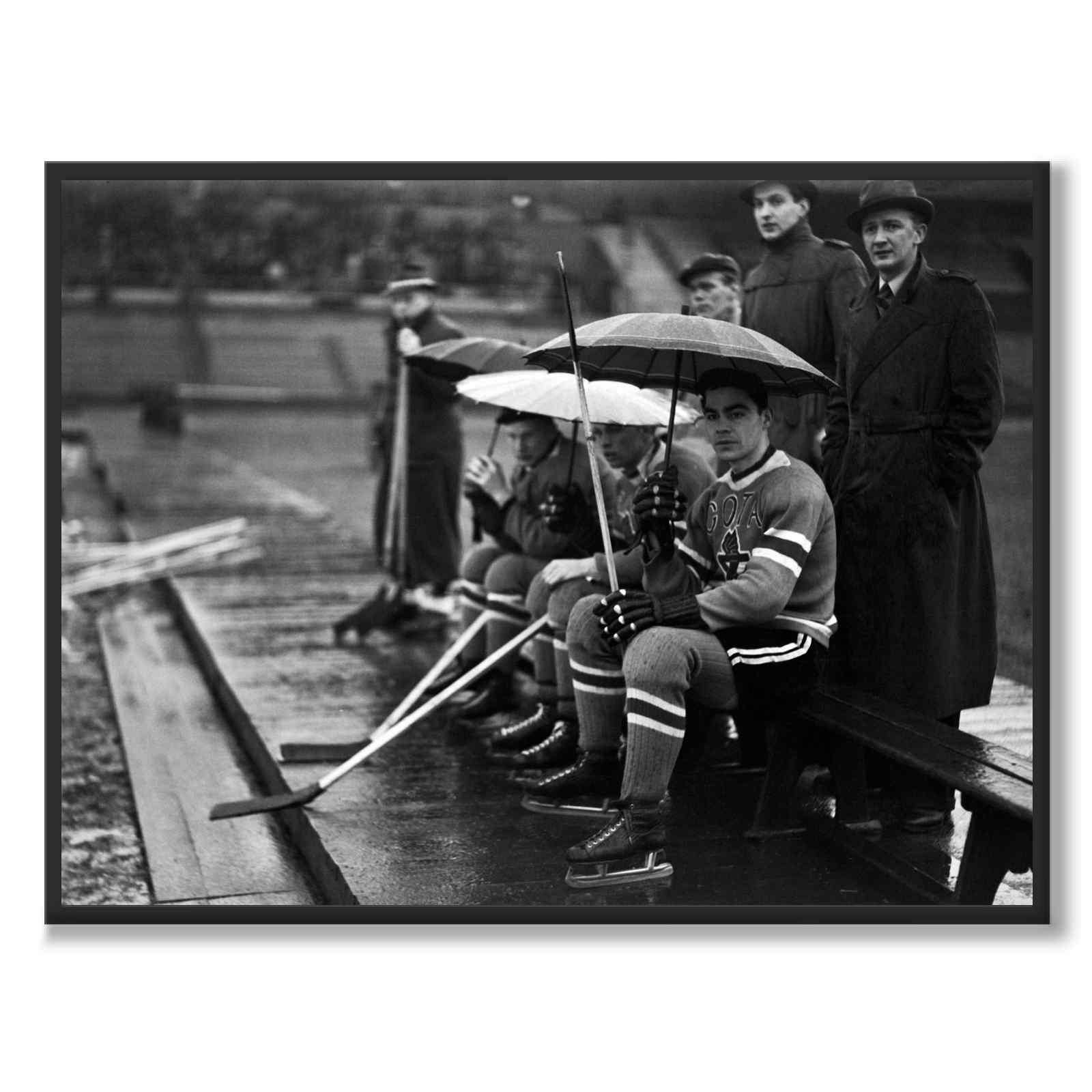 Poster with an old photograph from Stockholm in 1939. In the photo we see ice hockey players sitting in the substitution booth with umbrellas at Stockholm Stadium . The picture was taken during the match between Hammarby - Göta.