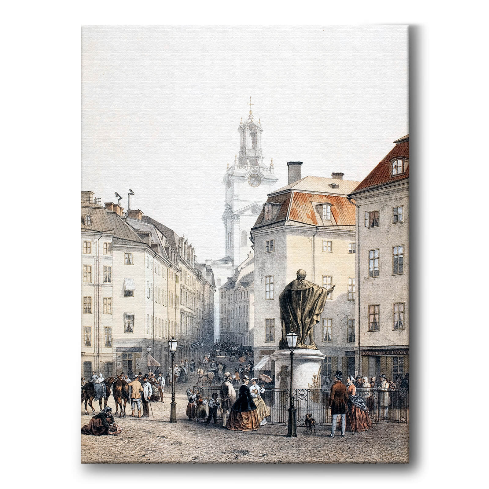 Canvas with a painting of the beautiful Storkyrkobrinken in Stockholm in the 1860s, painted by Carl Johan Billmark. Storkyrkobrinken is a street in the Old Town that runs from Storkyrkan to Myntgatan. It is as old as the Middle Ages when it was called Sankt Nicolai port (sancte nicolauese port, 1422).