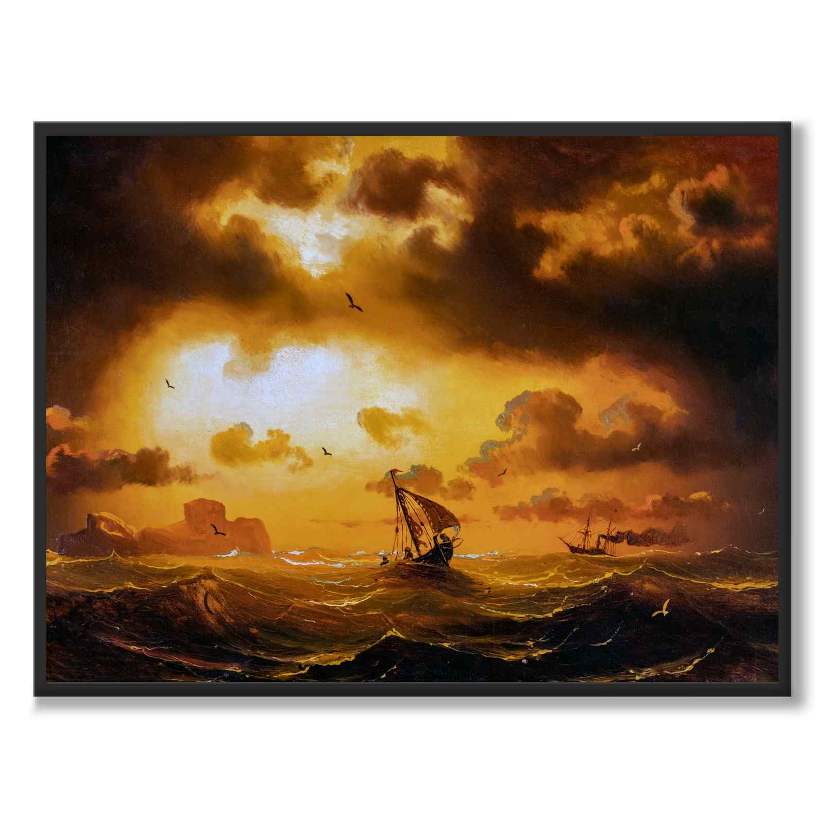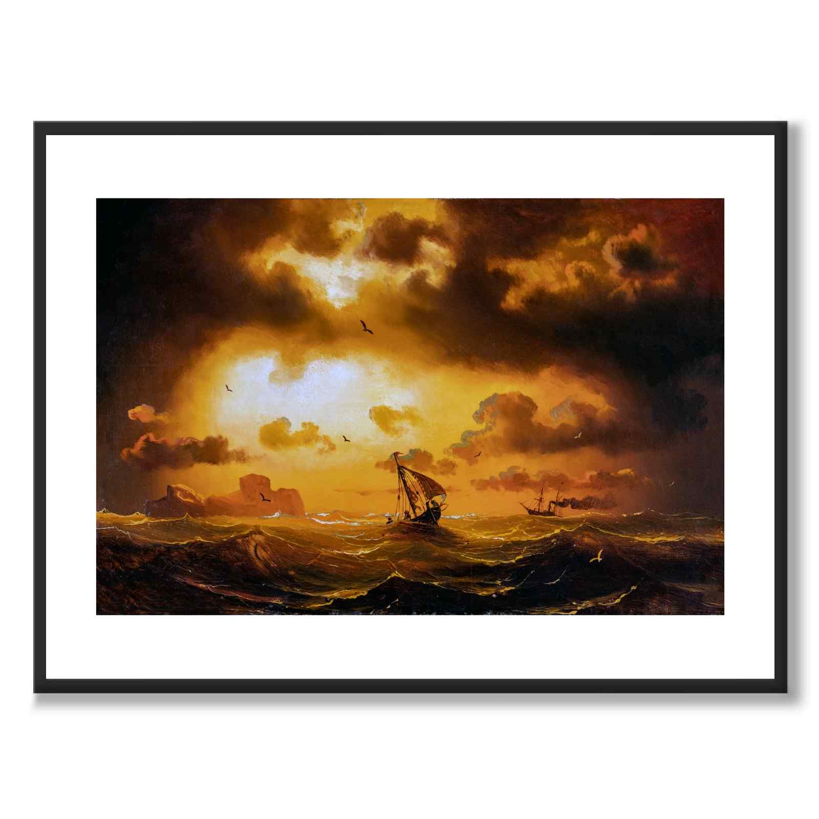 Poster with the beautiful painting Sunset at Sea, or Solnedgång på seat in Swedish. The painting is created in the middle by Marcus Larson, a Swedish painter.