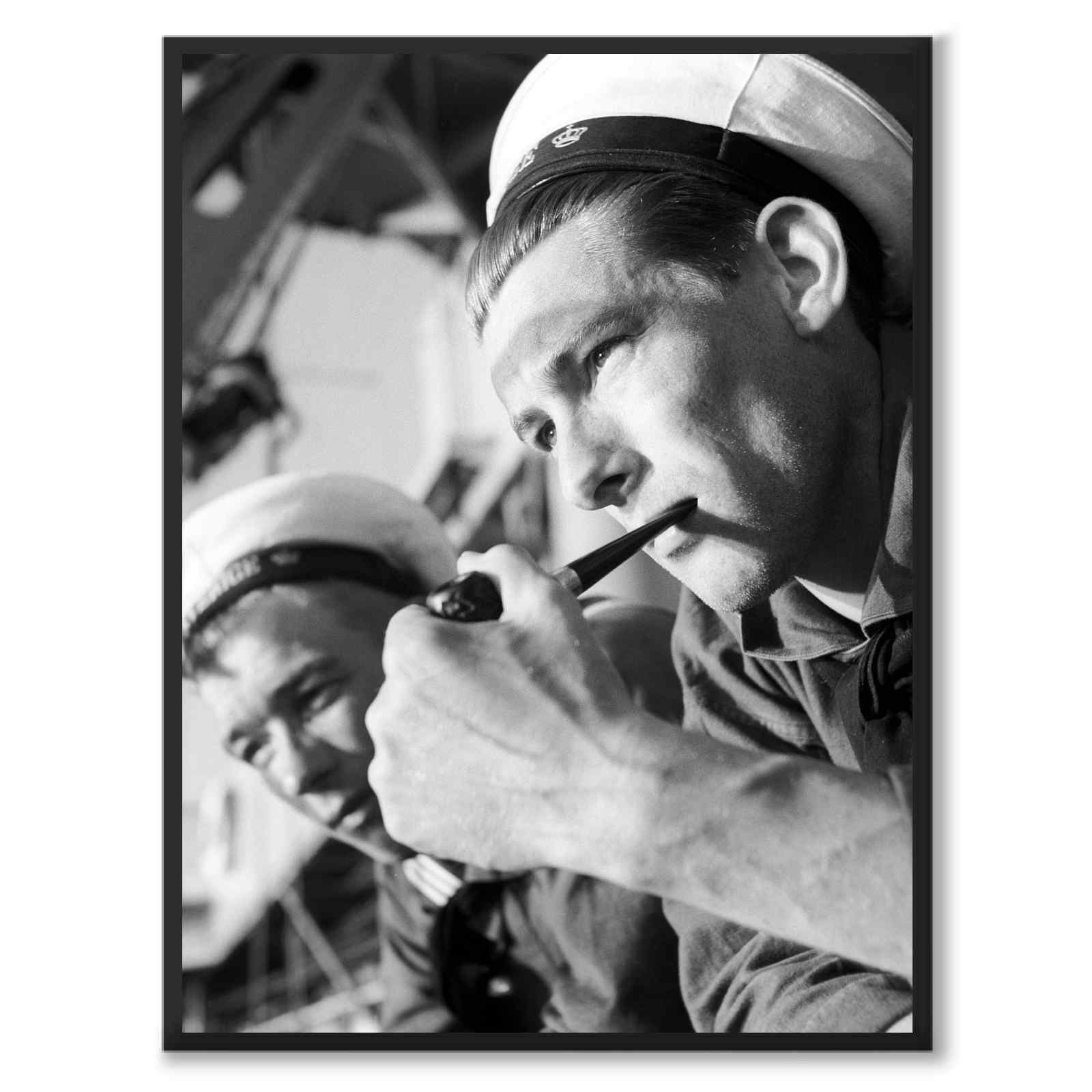 The photo is an effective close-up of two men from the crew smoking a pipe. Both men are wearing the uniform cap with the ship's name Sweden in gold letters on the front.