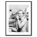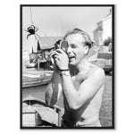 Poster featuring a photograph of a young man on the West Coast filming enthusiastically with his film camera. The motif is a crab. He focuses and films with the camera close to one eye while closing his eyes with the other. The photo was taken in Sweden during the 1940s.