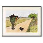 The illustration depicts a man with a large bag on his back, who appears to be on the move. He appears to be slightly upset by the dog's playful behavior, as he raises his stick in a warning gesture. In the background, an open landscape spreads out, with fields and a farm that gives a feeling of peace and freedom.