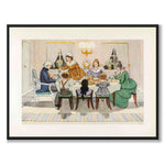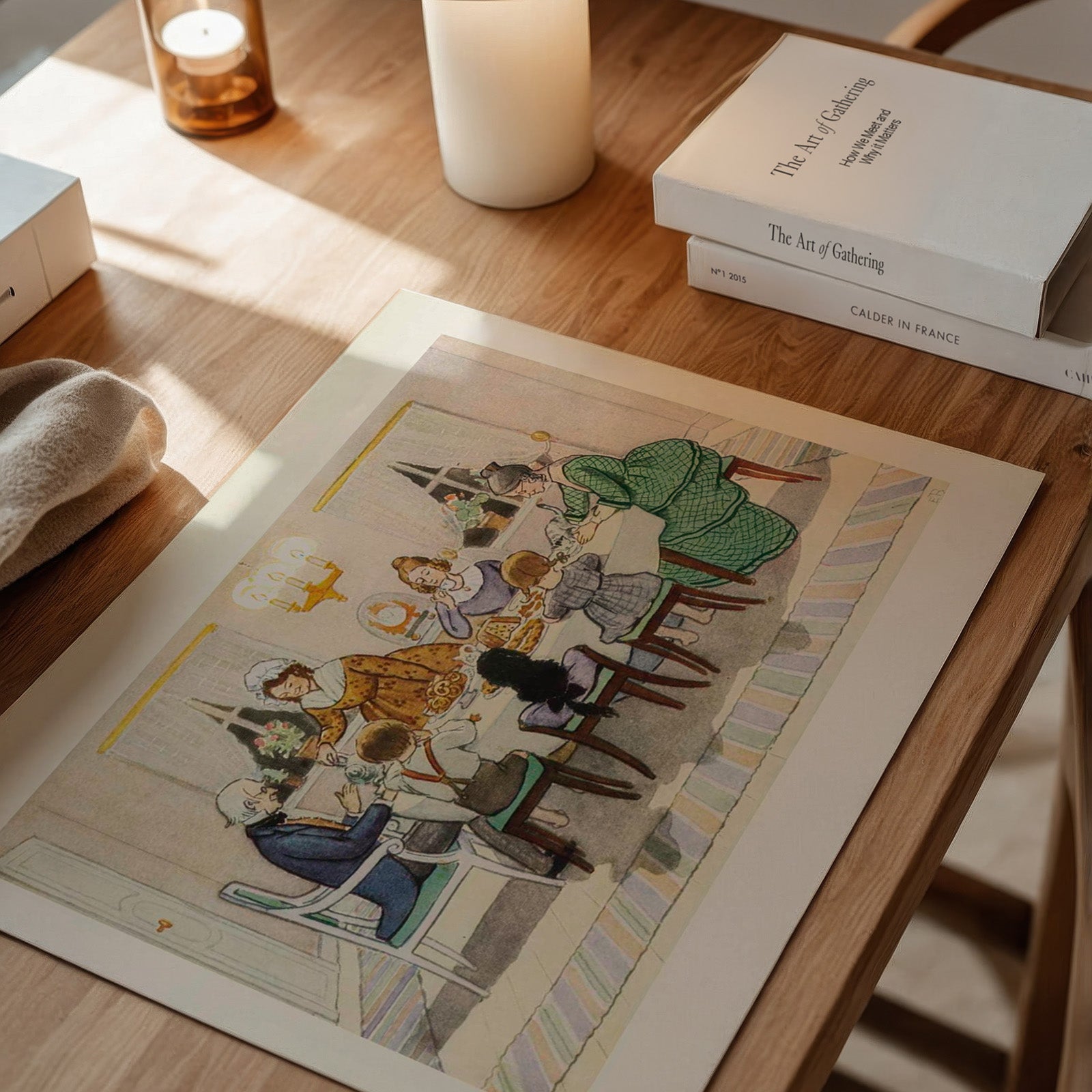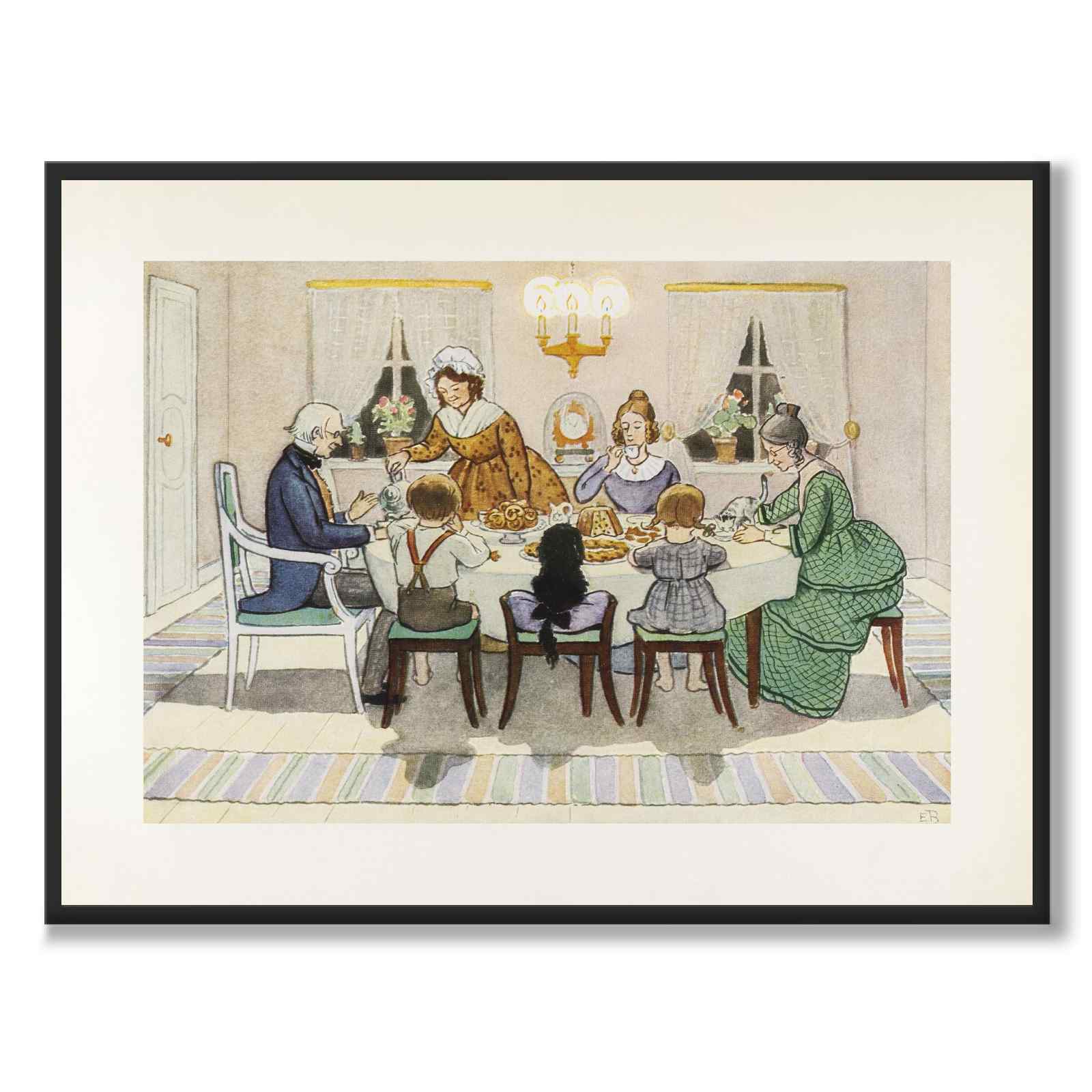 The picture shows a homely dinner where Aunt Green, Aunt Brown and Aunt Gredelin have invited Uncle Blue and the boy and girl who are recurring in the book series. Aunt Brun is at the table serving food, while the others are busy eating.