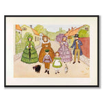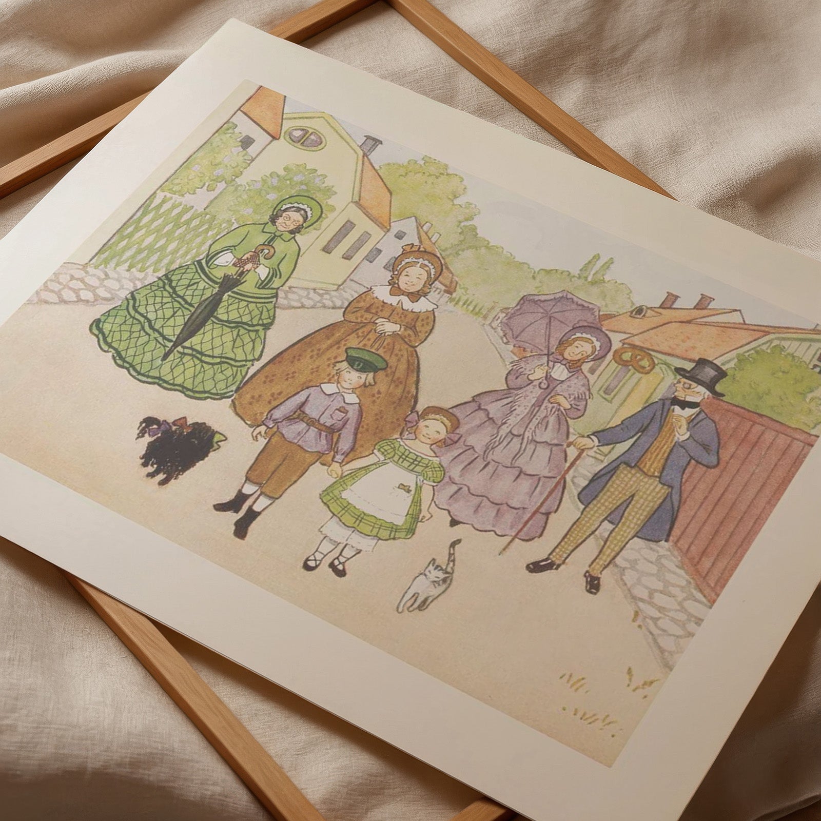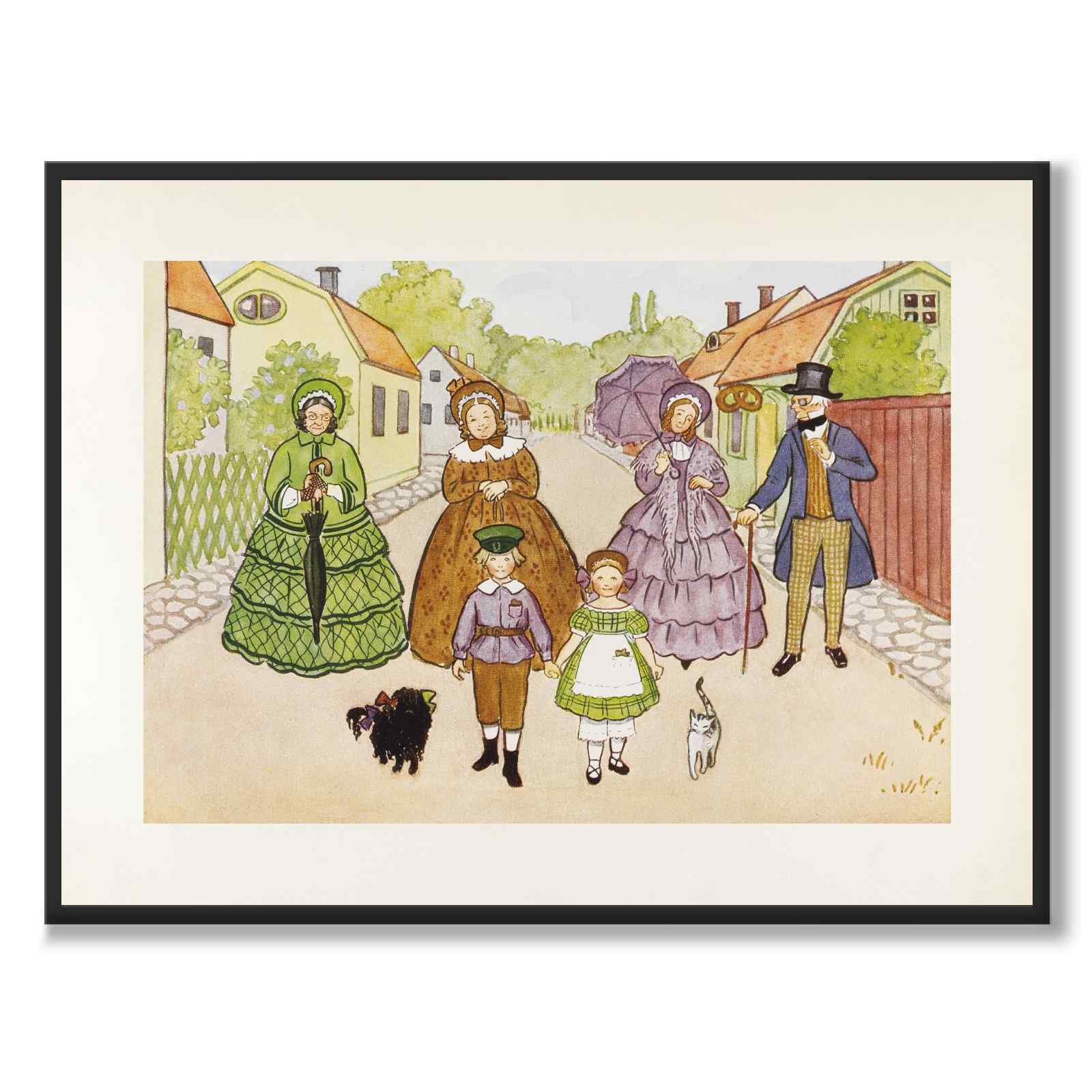 The illustration depicts Aunt Grön, Aunt Brown and Aunt Gredelin walking together Uncle Blue, the boy, the girl and their little dog along an idyllic village street. The charming and lively scene exudes a strong sense of community and warmth, perfectly framed by the rural setting.