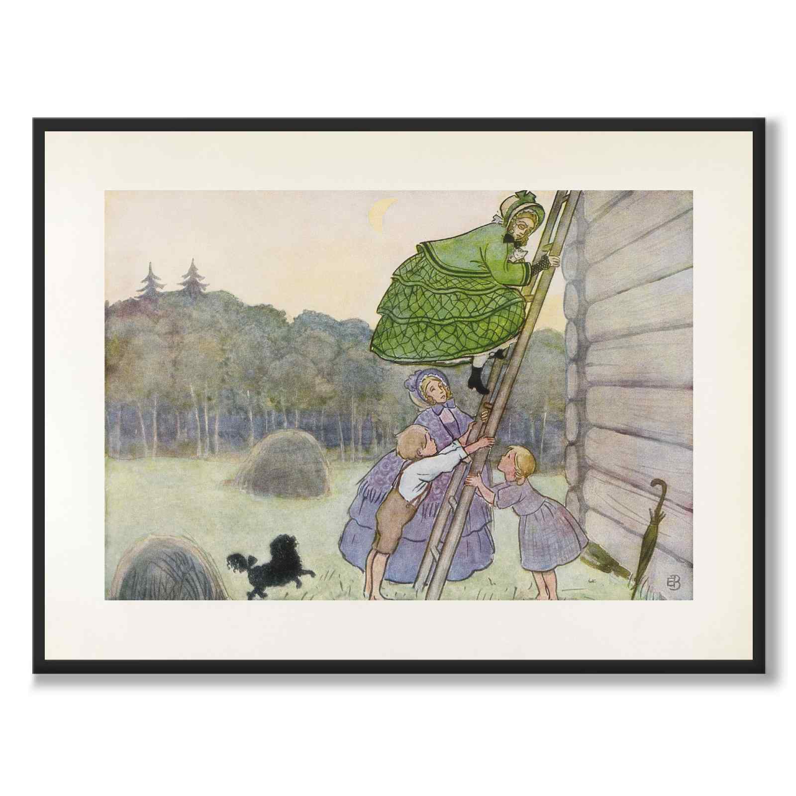 The picture shows Aunt Grön climbing down a ladder from a house. In this scene she is also helped by Aunt Gredelin, as well as two children - a boy and a girl.