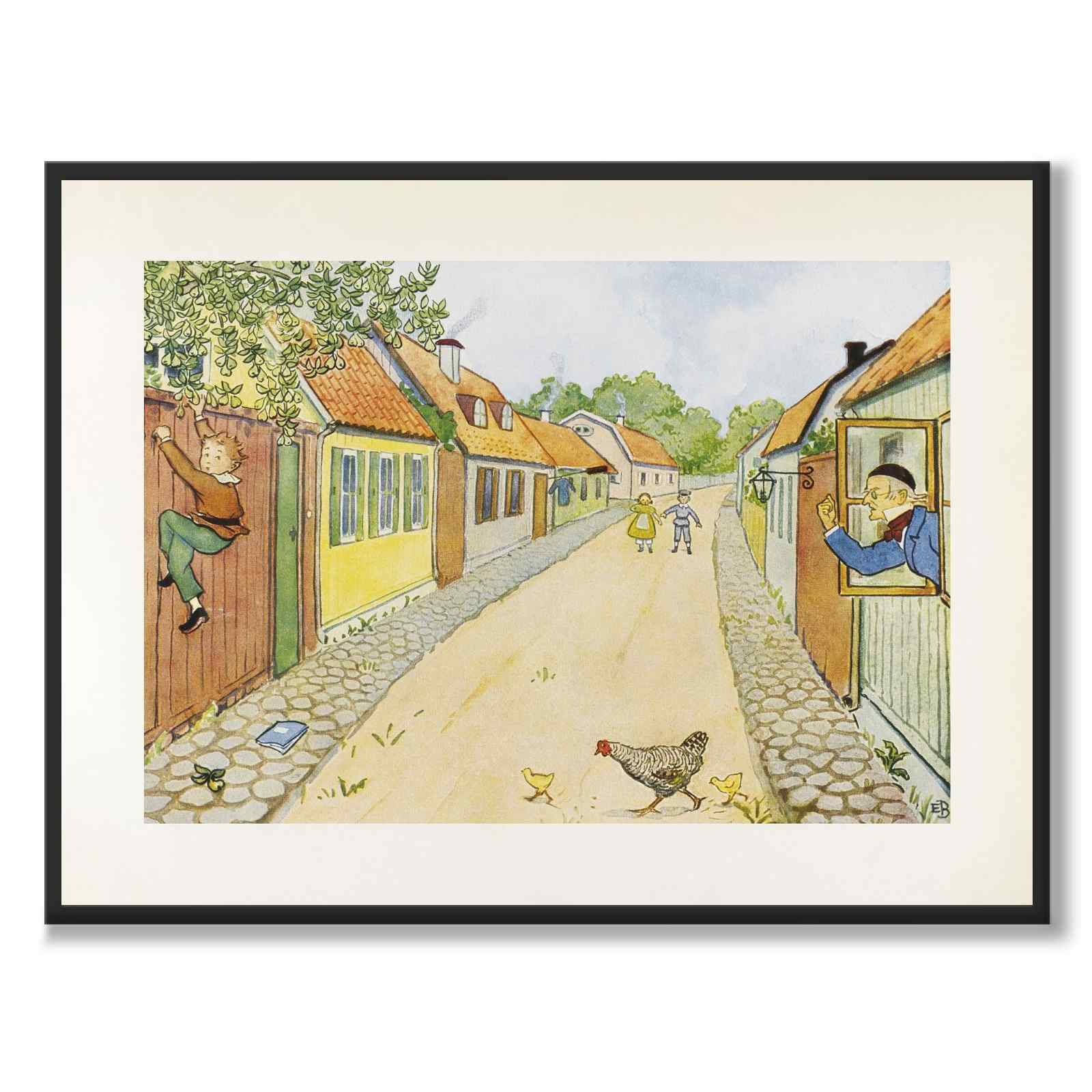 In the painting we see a boy who is in full swing with playful activities, and seems to have upset Uncle Blue a little. Uncle Blue is one of the adult characters in the books and is known for being a somewhat strict but well-meaning character who often appears to remind the children of rules and order.