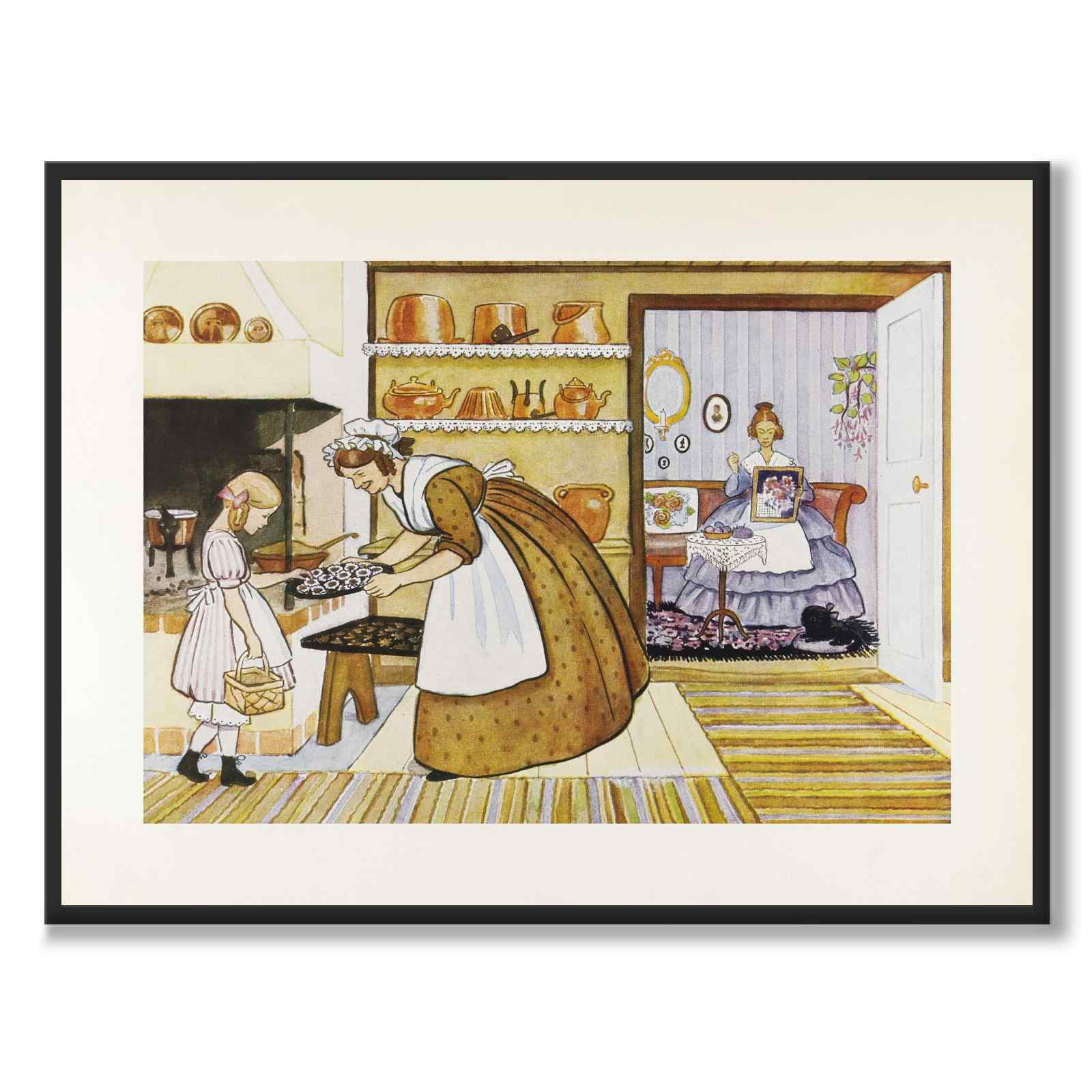The picture depicts an inviting indoor scene where Aunt Brun stands by a fireplace and serves freshly baked cookies to a little girl. In the background, Aunt Gredelin is sitting and embroidering a painting with a beautiful floral motif. This homely illustration is typical of Elsa Beskow's style, where she skilfully captures both the everyday chores and the familial presence in the home.