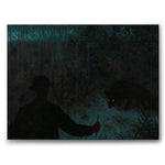 Canvas with the painting I am so hungry that my guts are howling, said the wolf by Theodor Kittelsen from 1900. The motif shows the boy Askeladden who meets a wolf in a dark forest late at night. The picture is an illustration to the Norwegian fairy tale Risen som ikke hadde noe hjerte på seg .