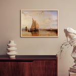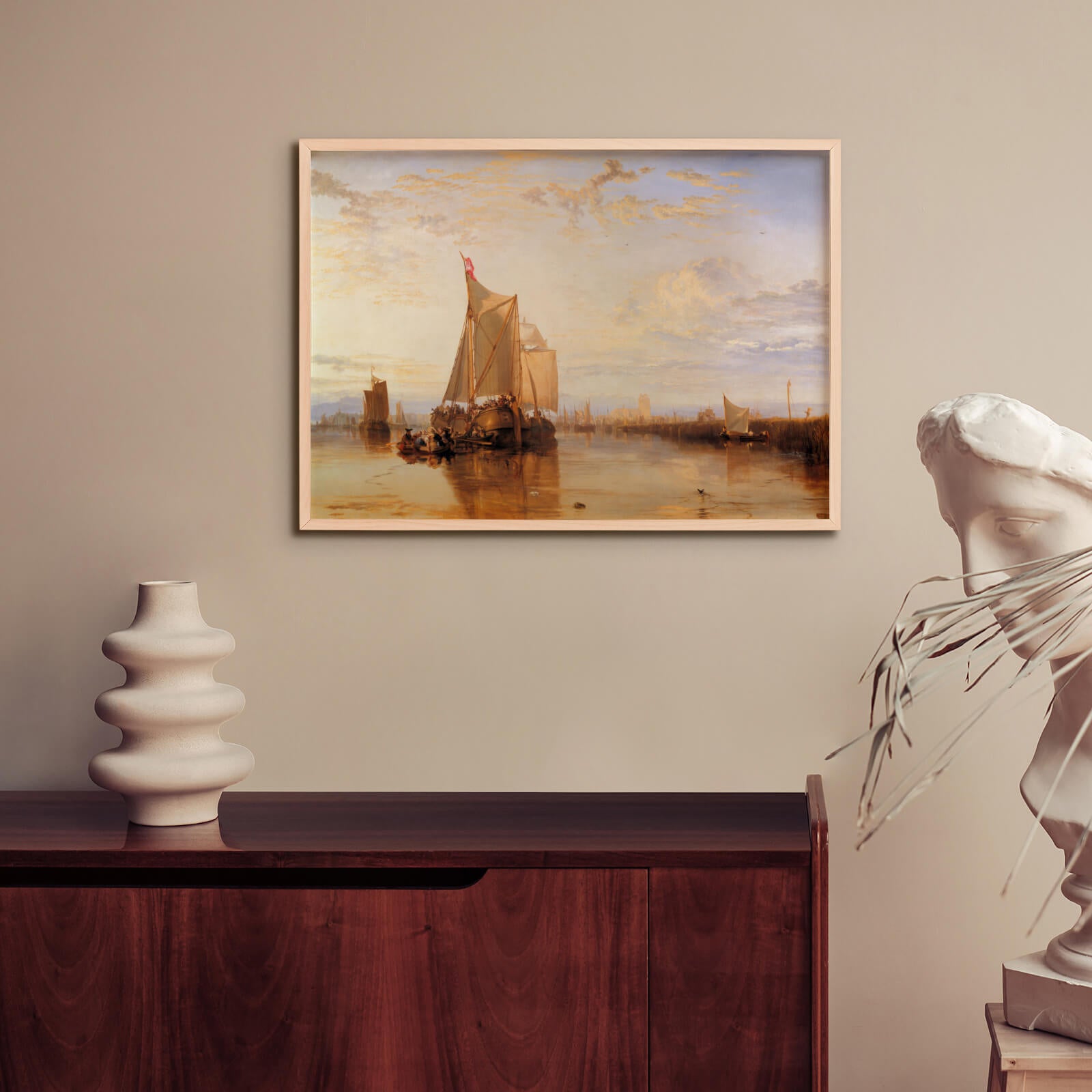 Poster with a beautiful painting painted by the British artist William Turner from the year 1818. The motif shows a fairy-tale golden glow over the harbor in Dordrecht, Netherlands (locally known as Dort). The sun shines softly over the many ships lying in the still water.