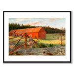 Poster with a painting from 1887 by the Swedish artist Hanna Hirsch-Pauli. The painting is called The Farm, or Ladugården in Swedish , and is painted in oil. In the picture we see a little girl looking out towards the barn where you can see people working.